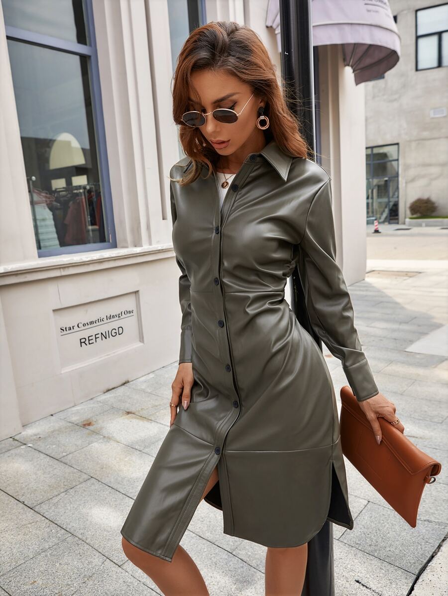 Vestido camisero PU con botón delantero bajo con abertura