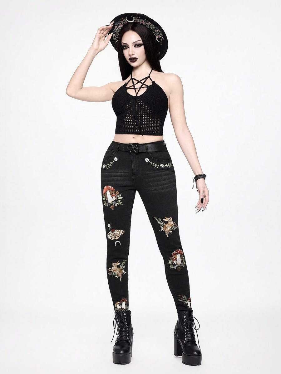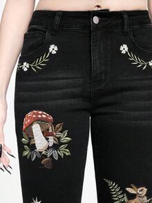 Fairycore Jeans de talle alto con bordado de plantas con estilo de setas oscuras para mujeres