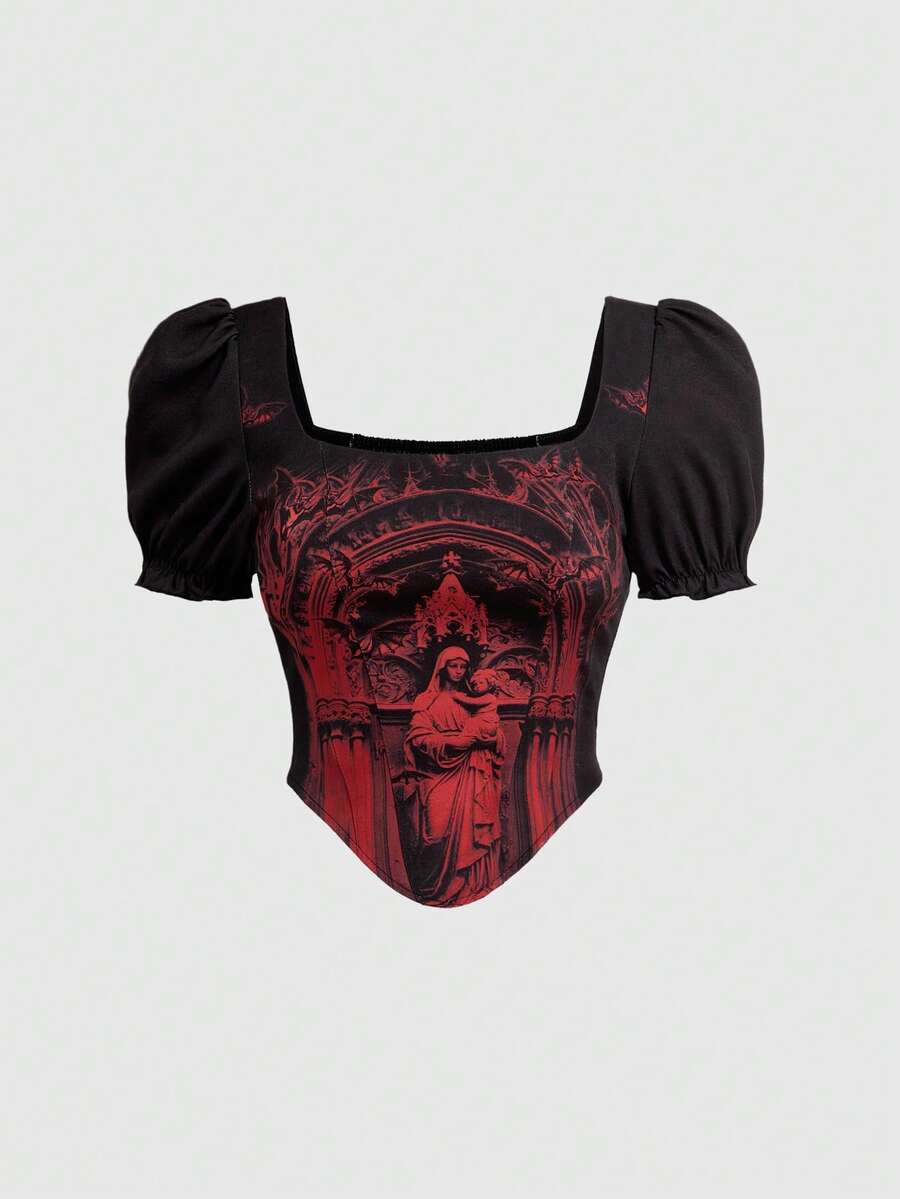 Goth Blusa ajustada de manga abullonada con cordones y estampado de iglesia y castillo de estilo gótico medieval y palaciego, en colores contrastantes