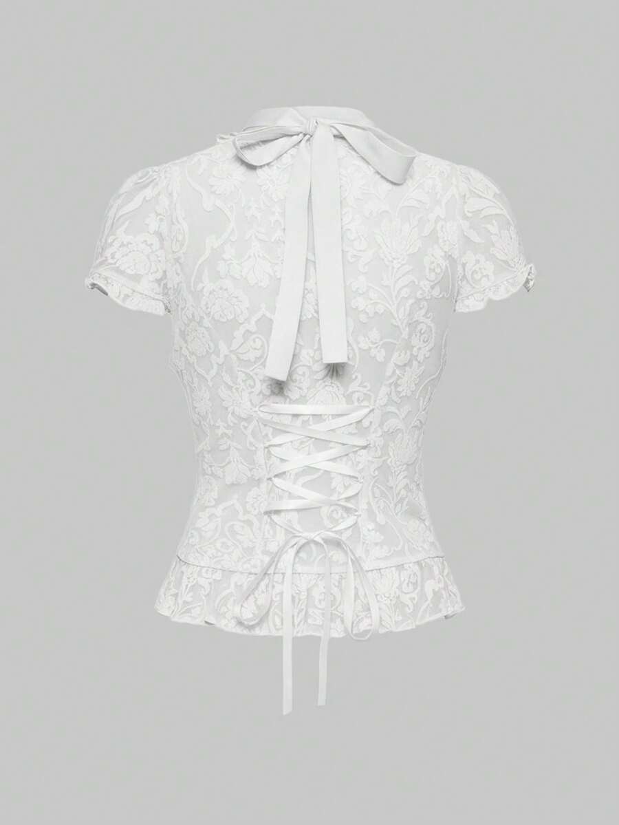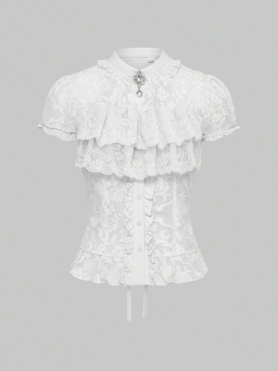 Goth Blusa de mujer con cuello de volantes desmontable estilo gótico palaciego con estampado, colgante de cristal barroco, puños de volantes acampanados y cintura ceñida