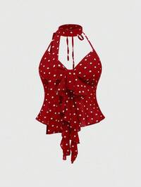 Top de mujer con cuello halter, volantes y estampado de lunares en toda la prenda de tela de gasa, en talla grande y estilo sexy Y2K