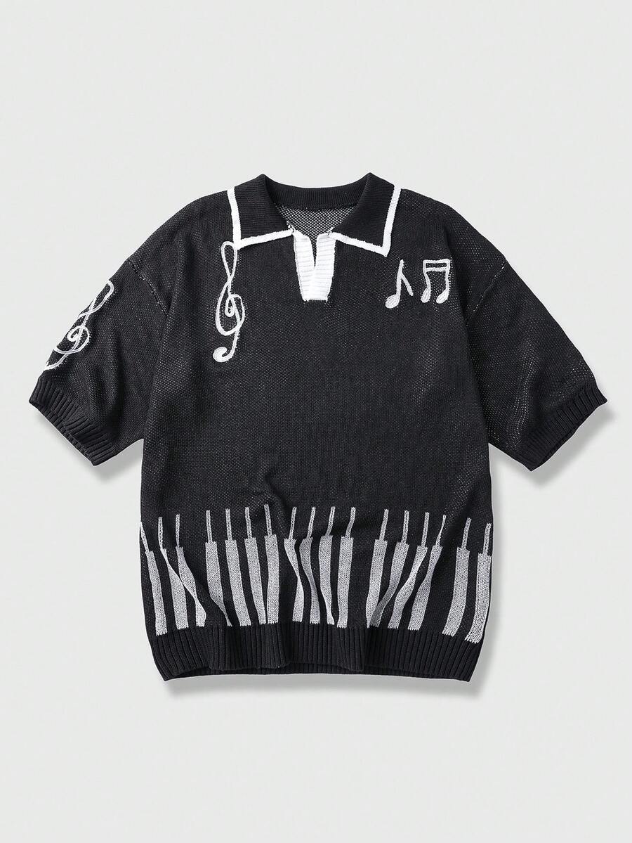 Blusa de punto casual con media cremallera, manga corta y estampado de notas musicales de color contrastante