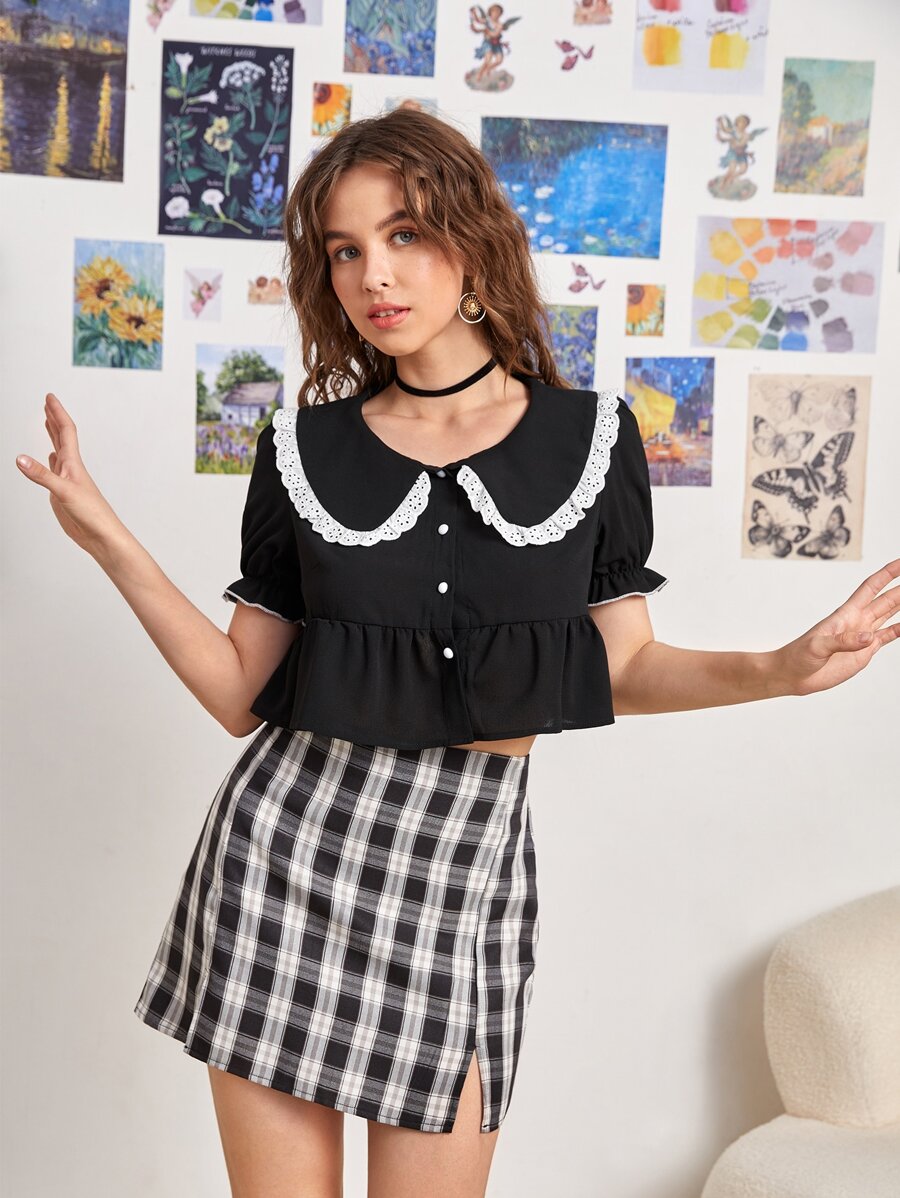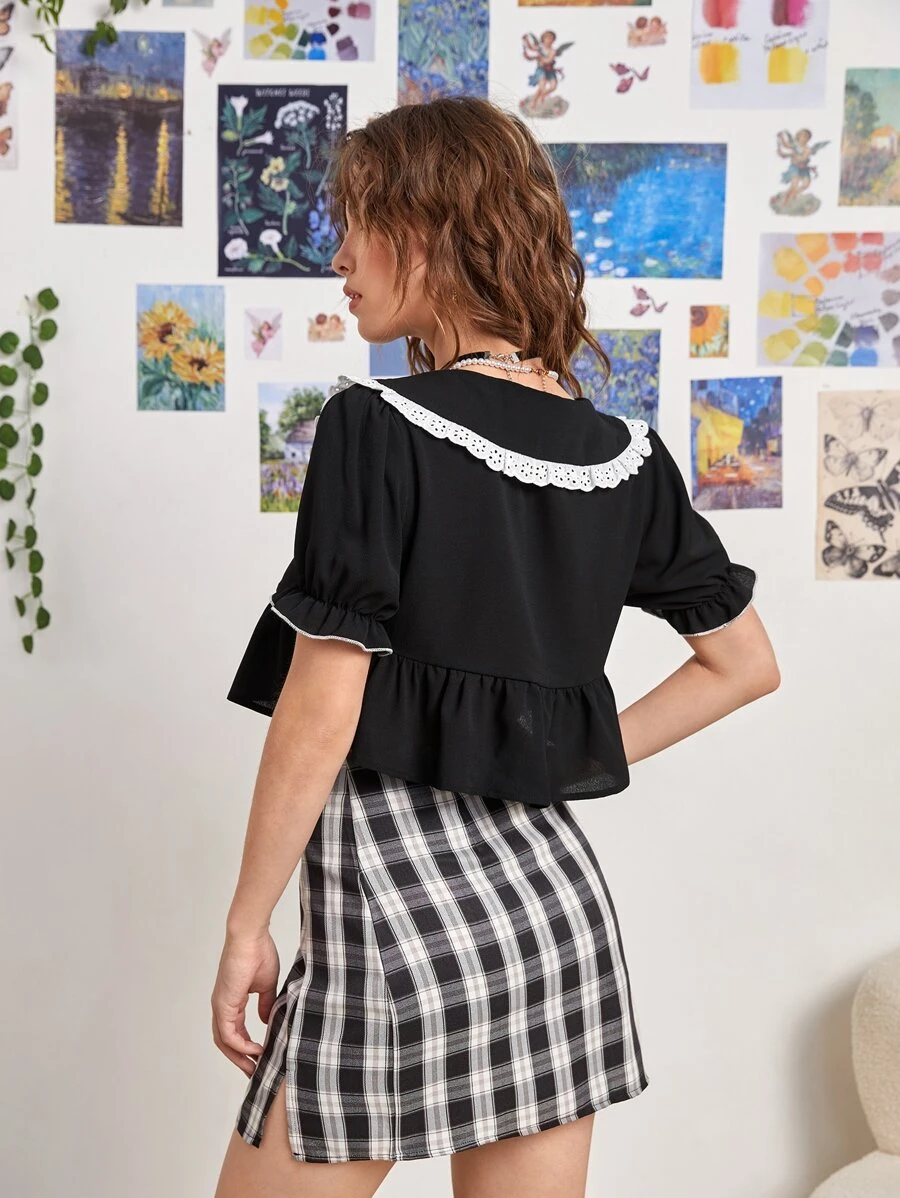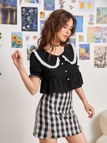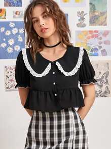 Blusa de cuello exagerado ribete con encaje bajo con fruncido