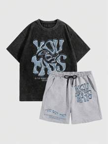 Street Life Set de 2 piezas de Top casual de manga corta con cuello redondo y estampado de letras, y shorts para hombre