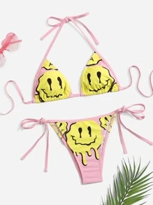 Street Life Conjunto de bikini de verano de playa con gráficos de caritas en triángulos y lazos en los costados