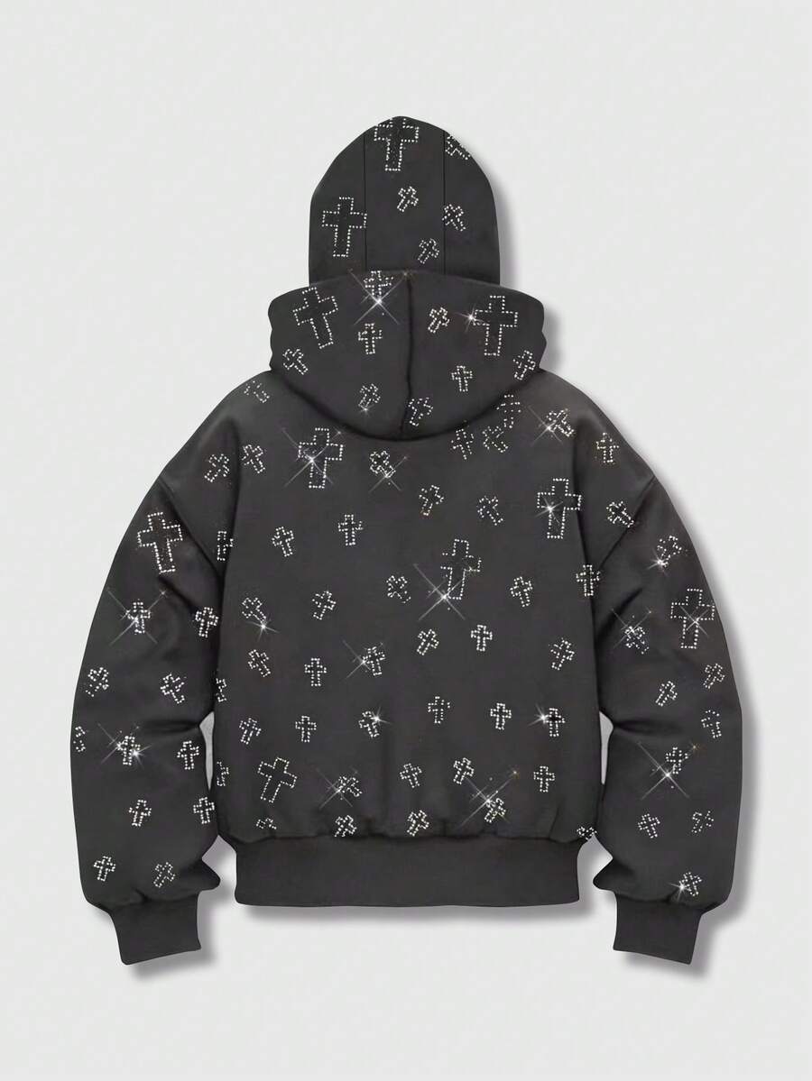 Street Life Sudadera con capucha con bolsillos y adornos de strass con cremallera delantera, sudadera con capucha de moda para hombres