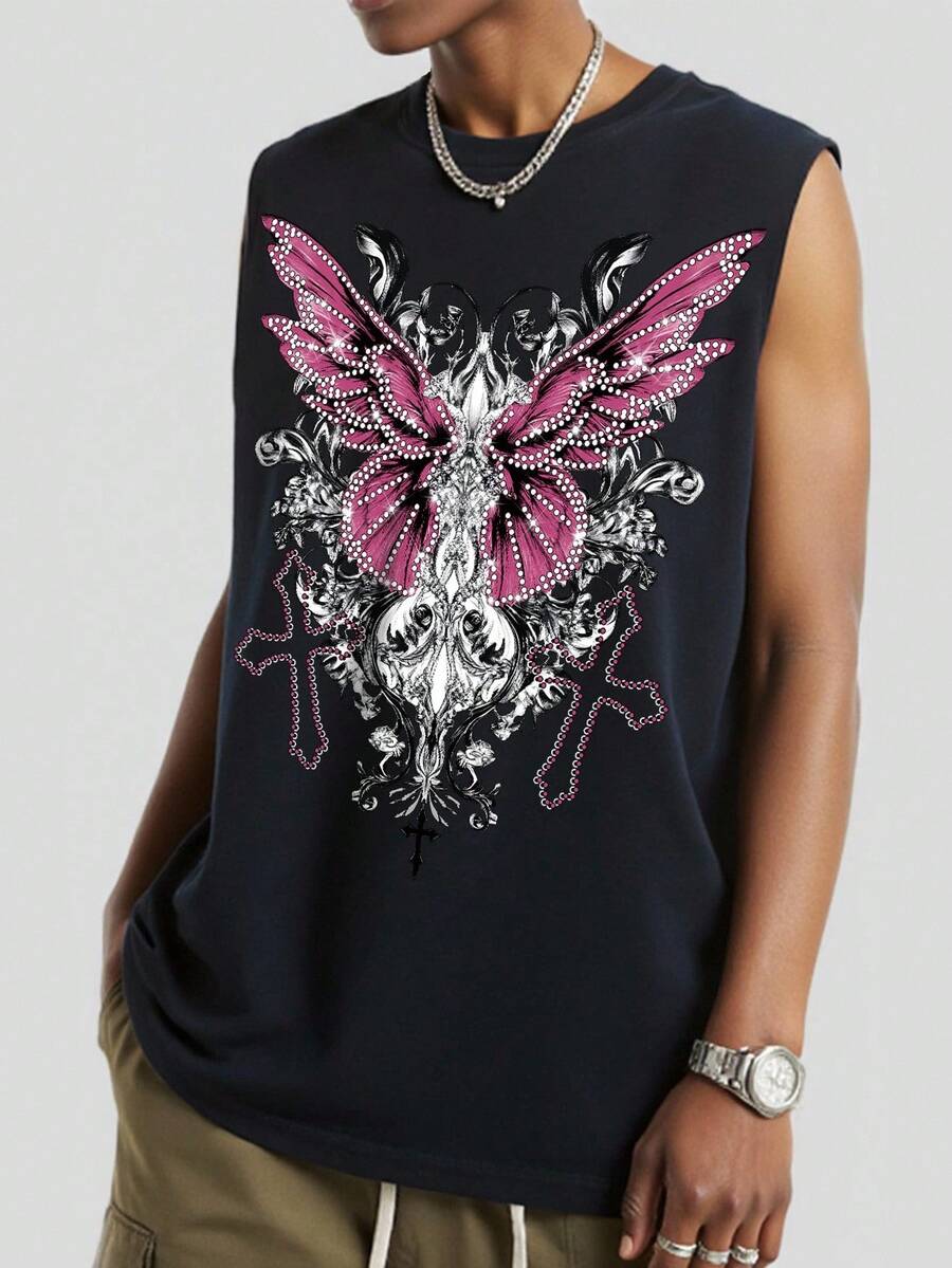 Goth Camiseta sin mangas negra de uso casual con estampado de alas de flor y cruz para hombres
