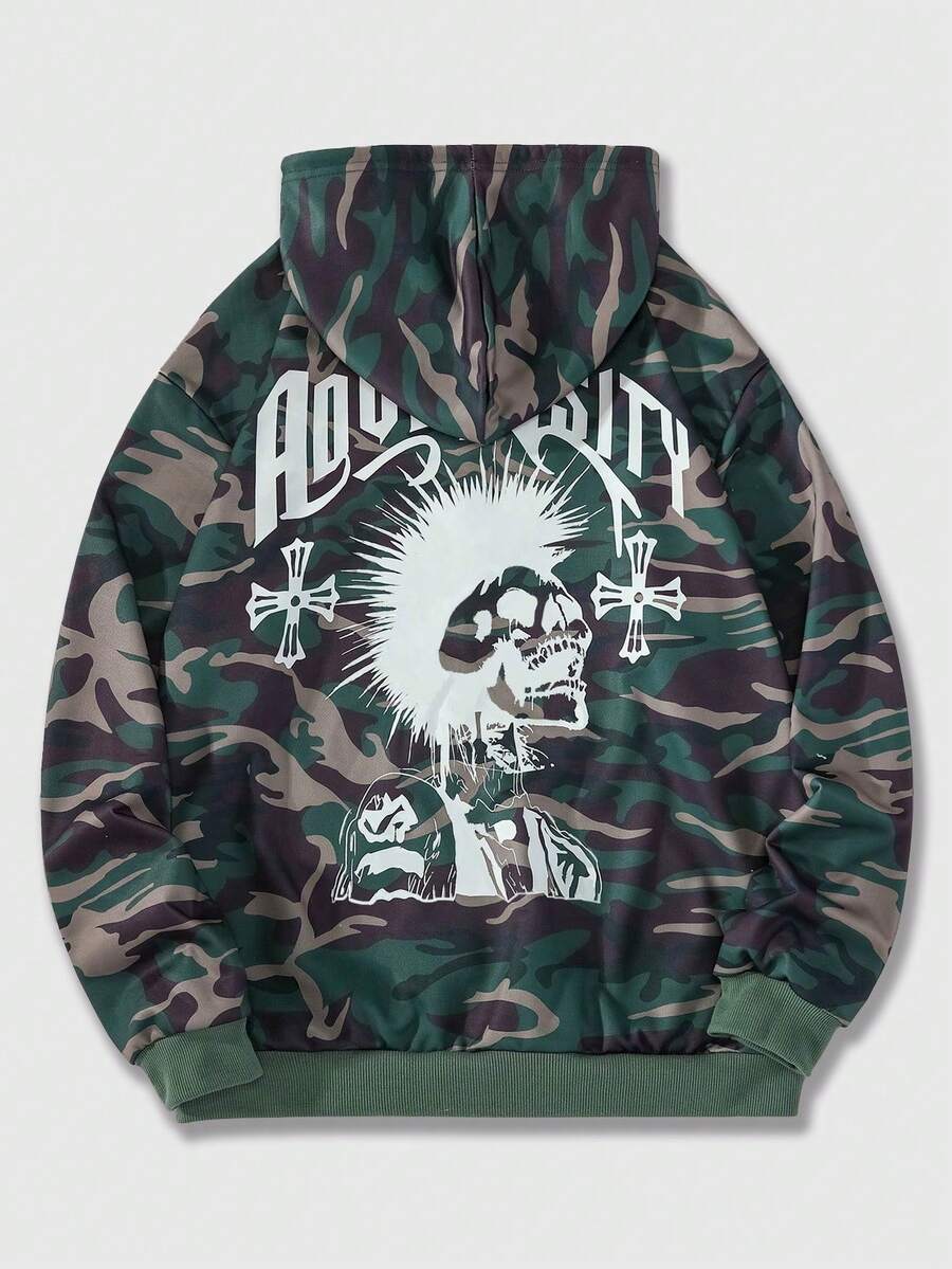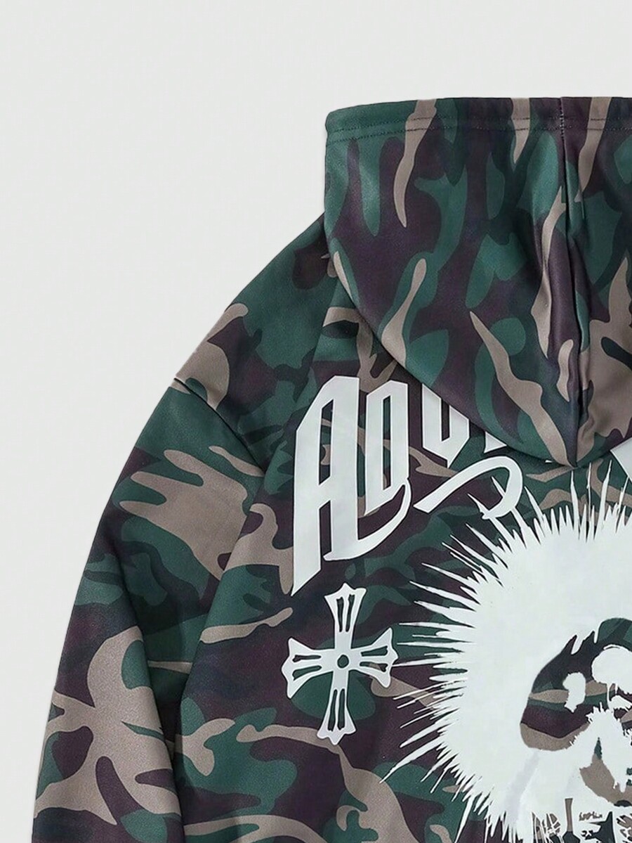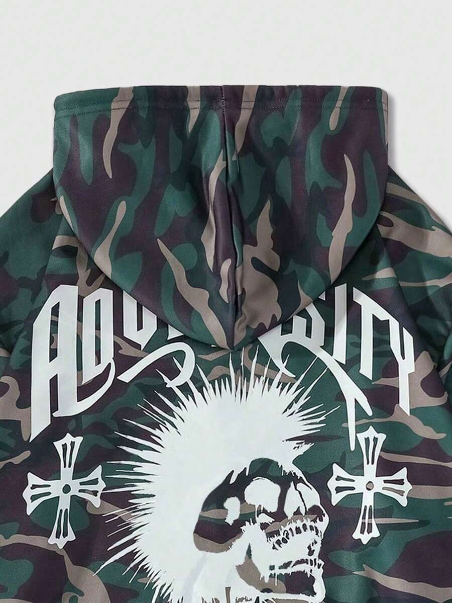 Street Life Hombres Capucha de camuflaje con letra & estampado de cráneo con bolsillo de canguro con cordón