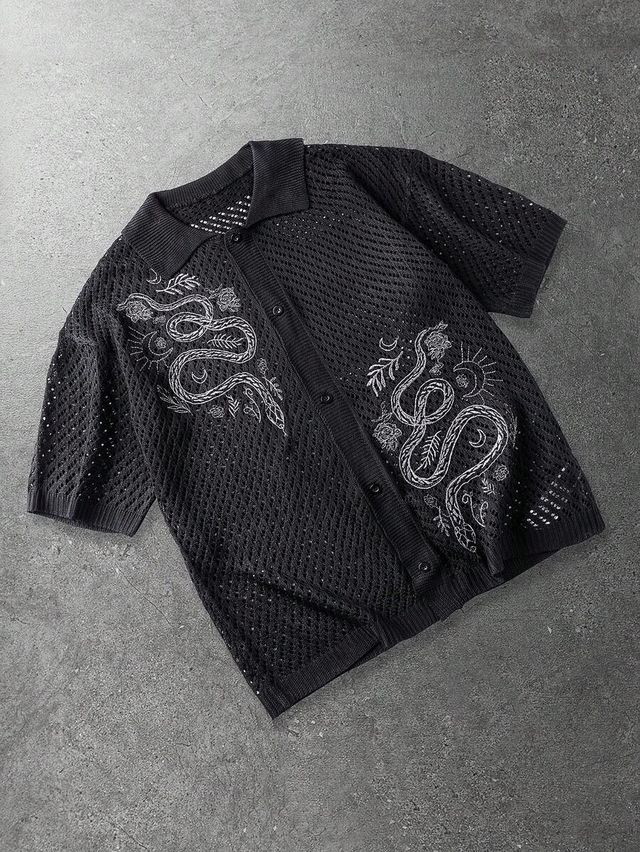 Street Life Camisa de punto casual de manga corta con botones delanteros y bordado hueco para hombres