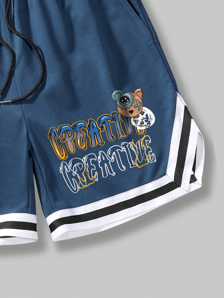 Street Life Conjunto de dos piezas de hombre con camiseta tipo jersey de baloncesto con estampado de oso de dibujos animados y letras, y pantalones cortos con cordón, para la escuela