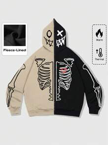 Street Life Sudadera con capucha de cremallera de dos tonos con estampado de dibujos animados y esqueleto, casual y de urbana para hombres, forrada térmicamente para otoño/invierno