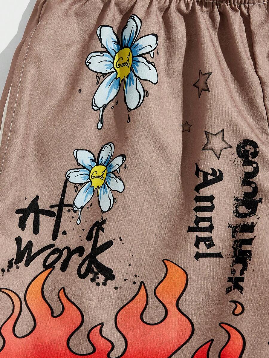 Street Life Pantalones cortos con cordón en la cintura con gráfico de flor y letra de fuego, para escuela