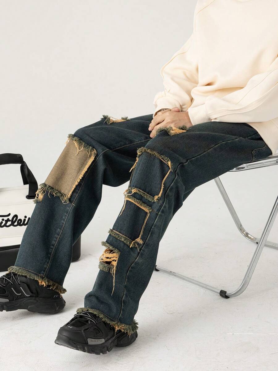 Street Life Vaqueros De Hombre Con Parches Desgastados Y Parches De Mezclilla, Adecuado Para Todas Las Estaciones