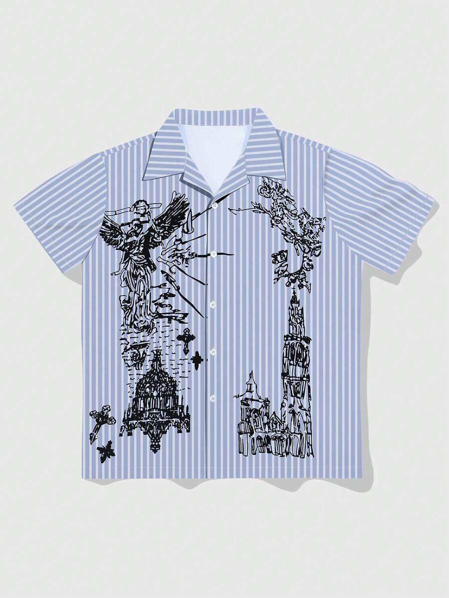 Street Life Camisa casual de manga corta con estampado de rayas de ángel de un solo pecho para hombres