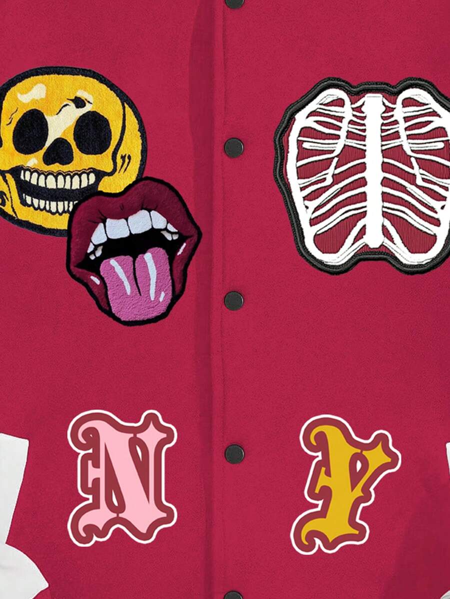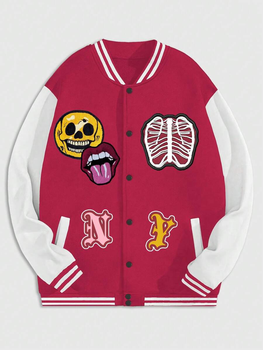Street Life Chaqueta casual de béisbol de manga larga con estampado de letras y labios para hombre, streetwear de otoño