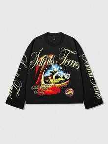 Street Life Camiseta casual de cuello redondo de manga larga con estampado de letras negras para hombre, otoño/invierno