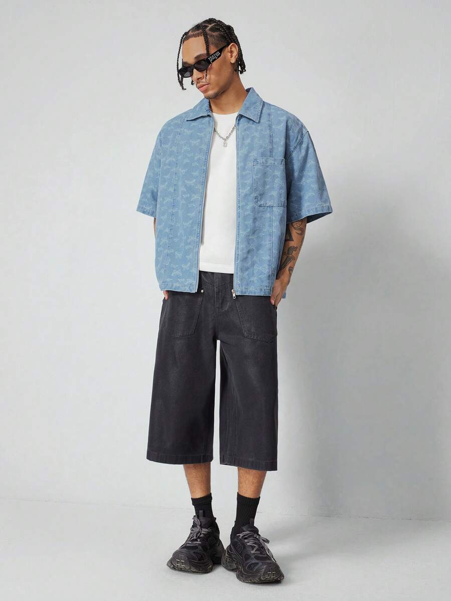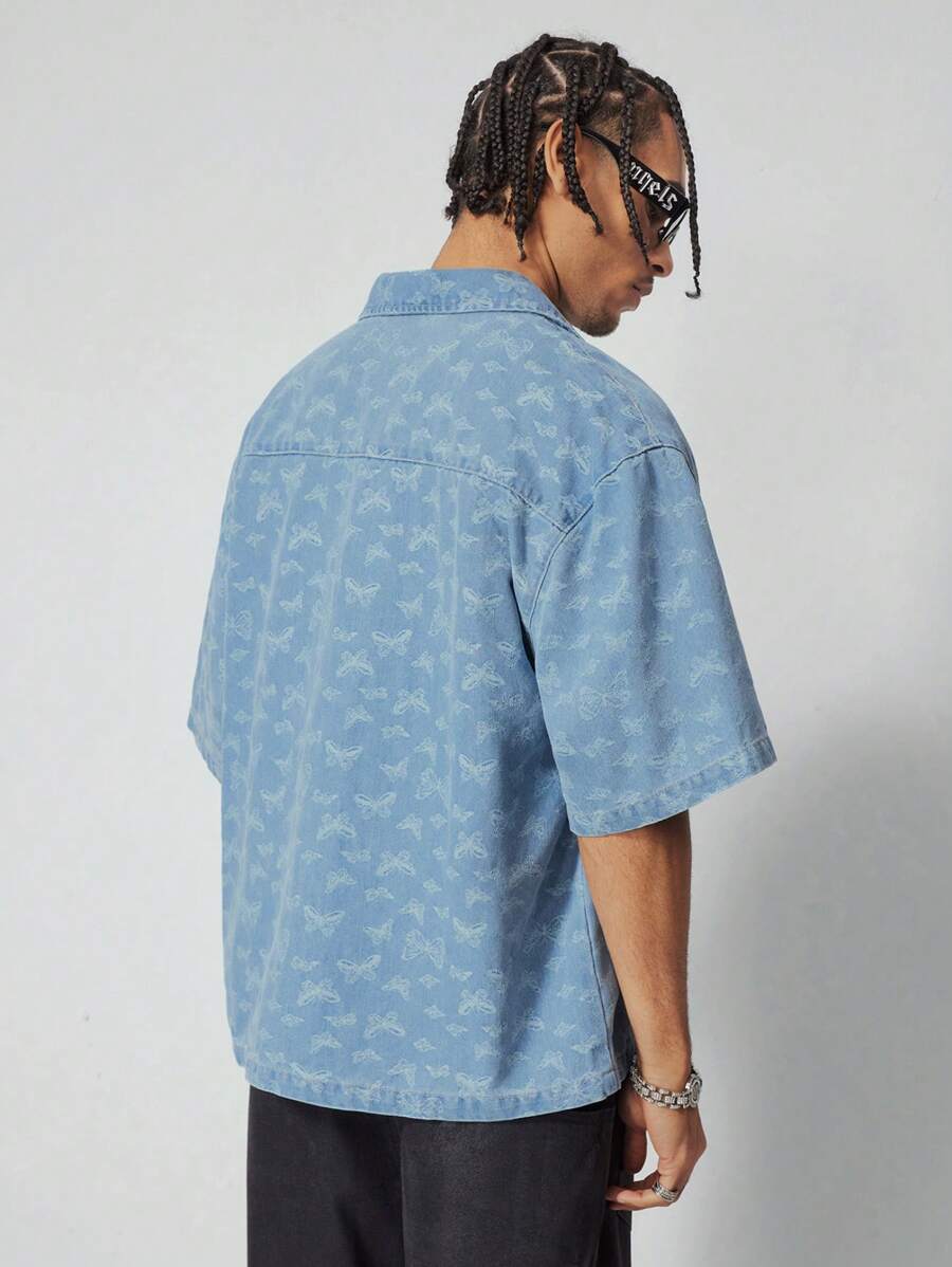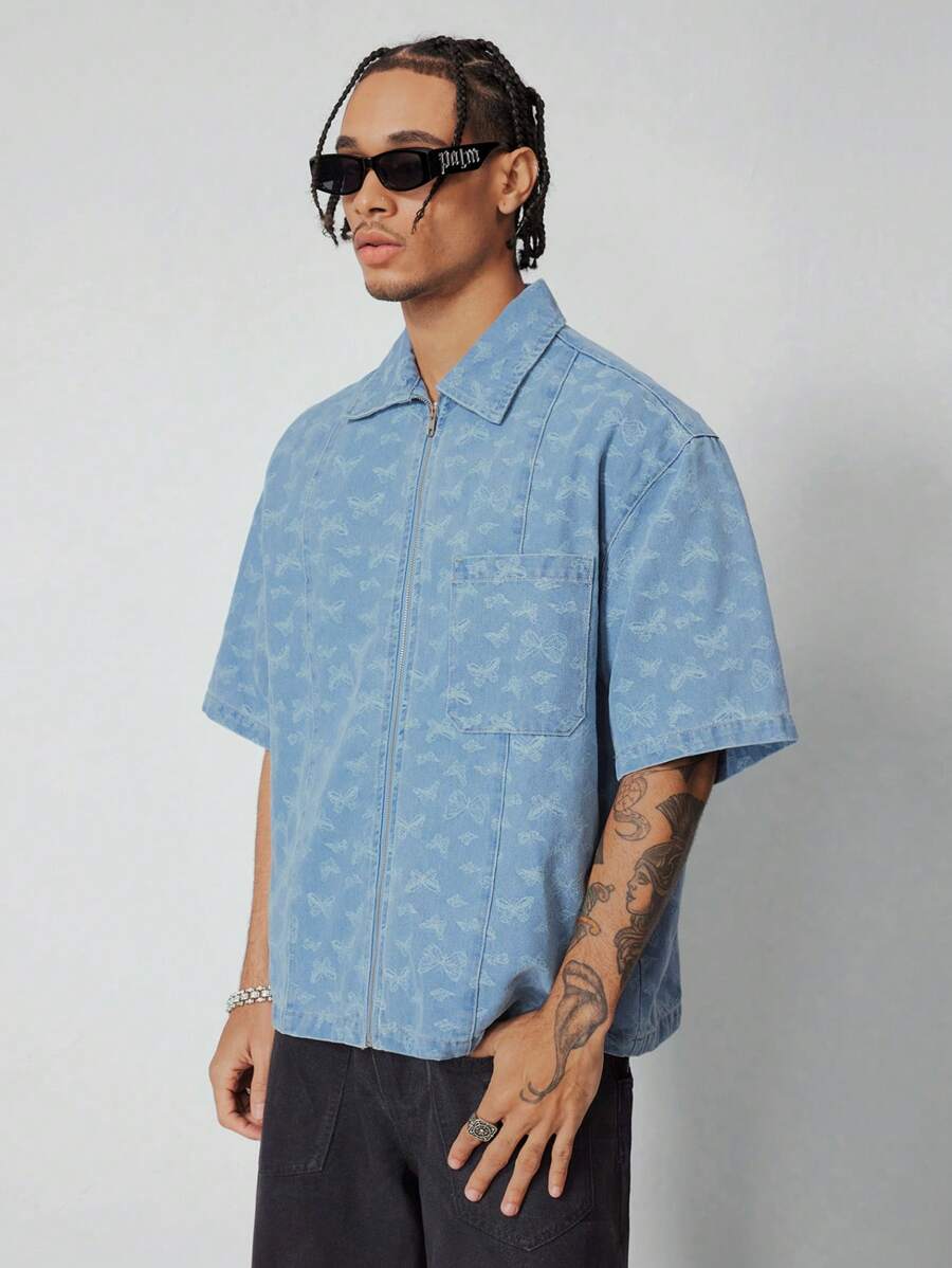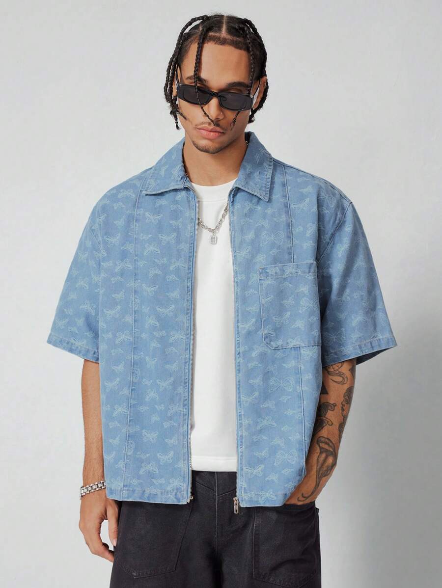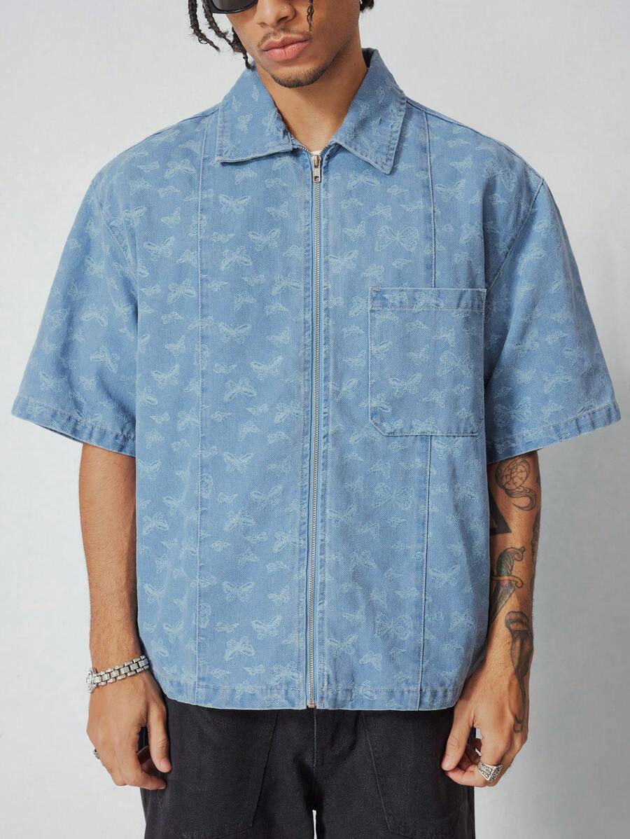 Street Life Chaqueta de mezclilla casual con cremallera y manga corta con estampado de mariposa para hombre