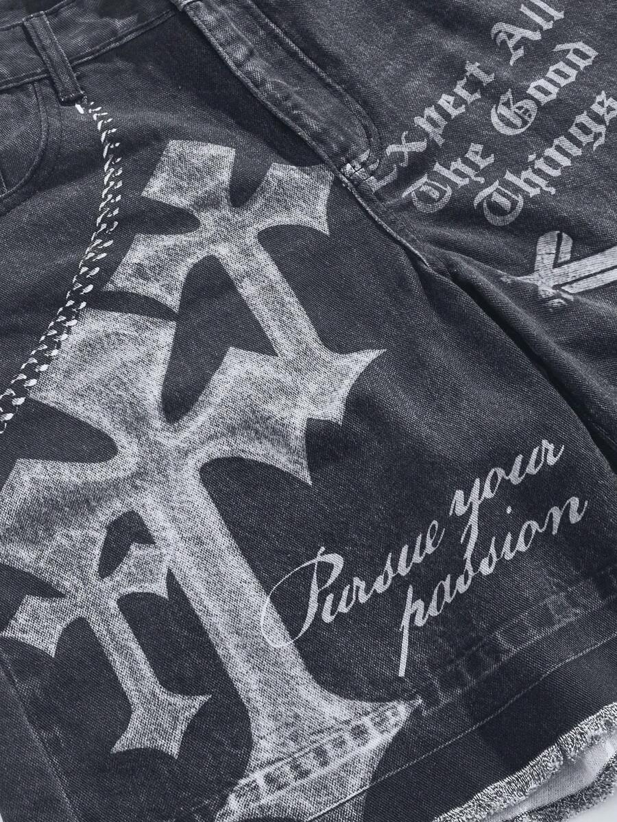 Street Life Pantalones cortos de mezclilla casuales para hombres con estampado de cruz lavados y lema