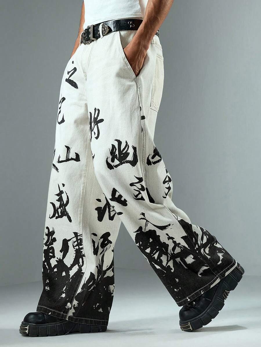Street Life Jeans de hombre con estampado digital de caracteres chinos y parches