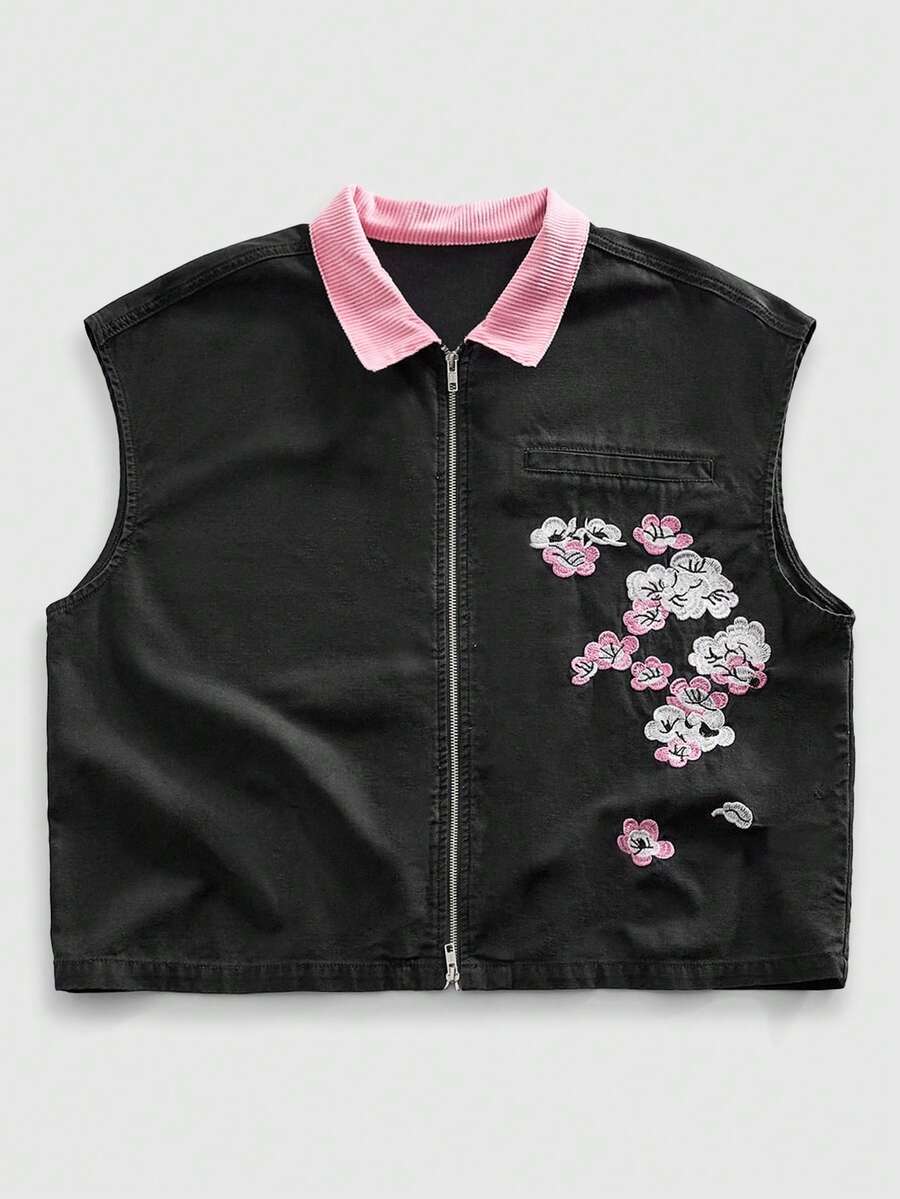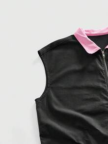 Street Life Chaqueta vaquera sin mangas con cremallera, cuello de color contrastante y parches, de moda y versátil para hombres