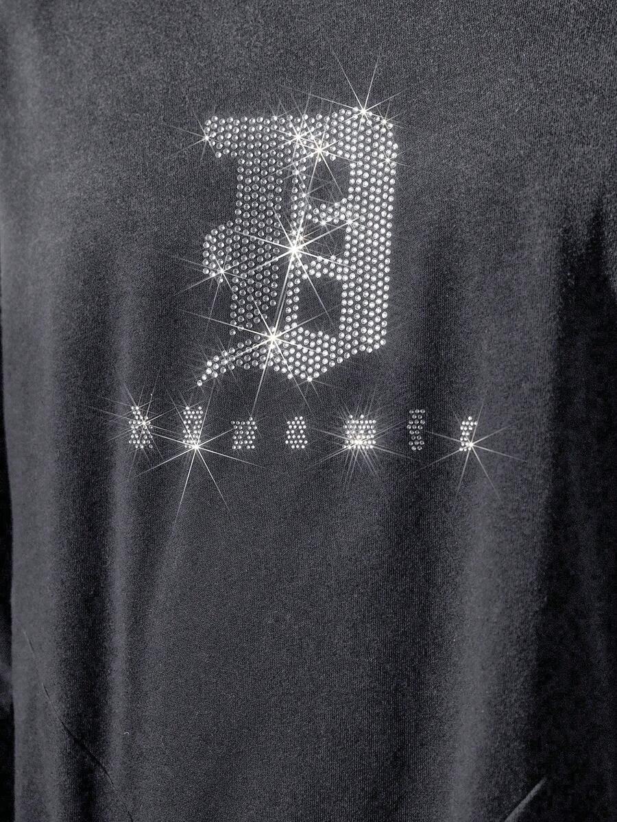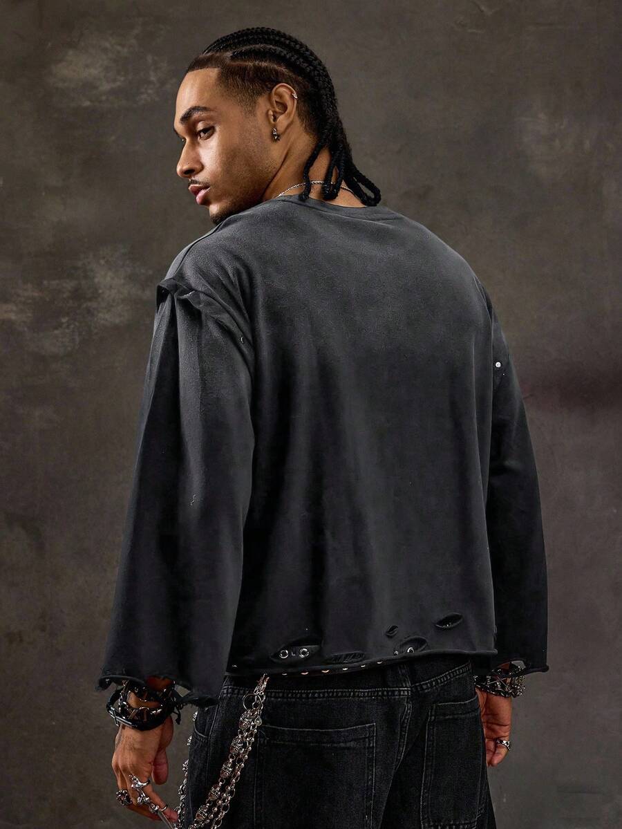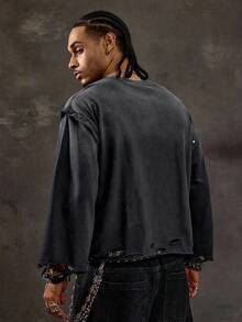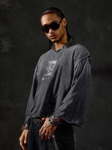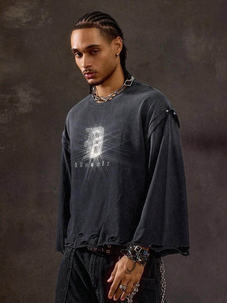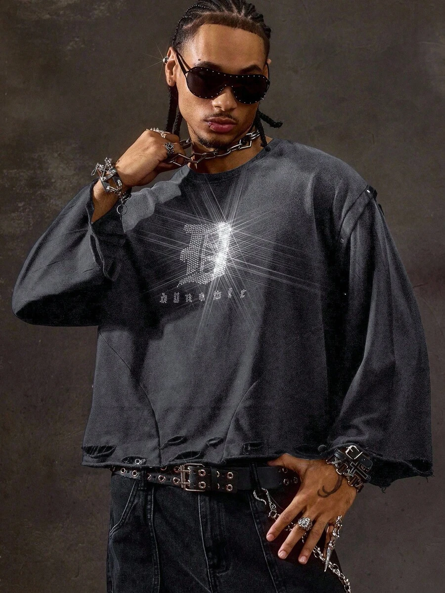 Street Life Camiseta de manga larga con estampado de diamantes desgastados para hombre, corte holgado y acortado