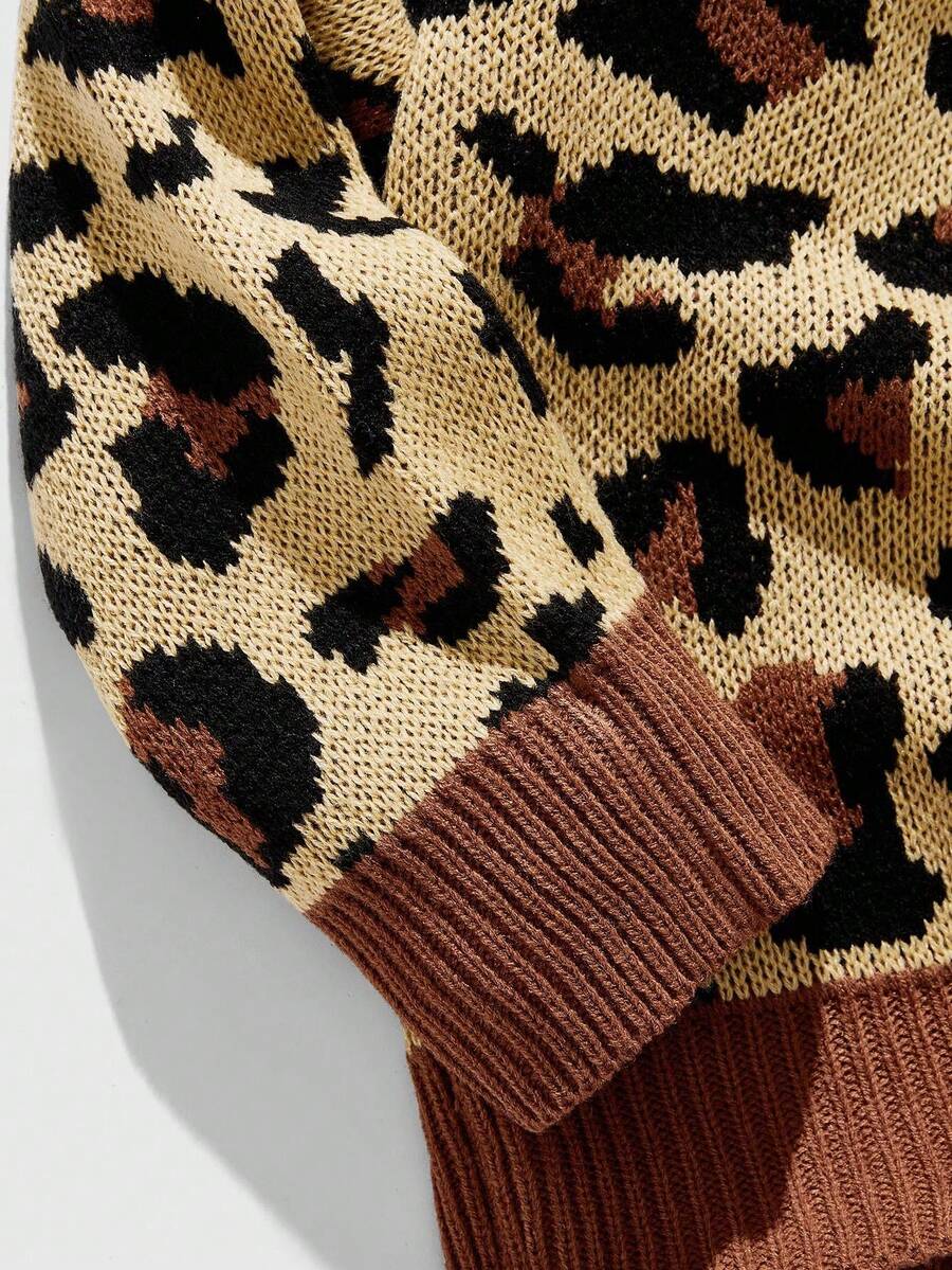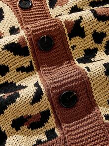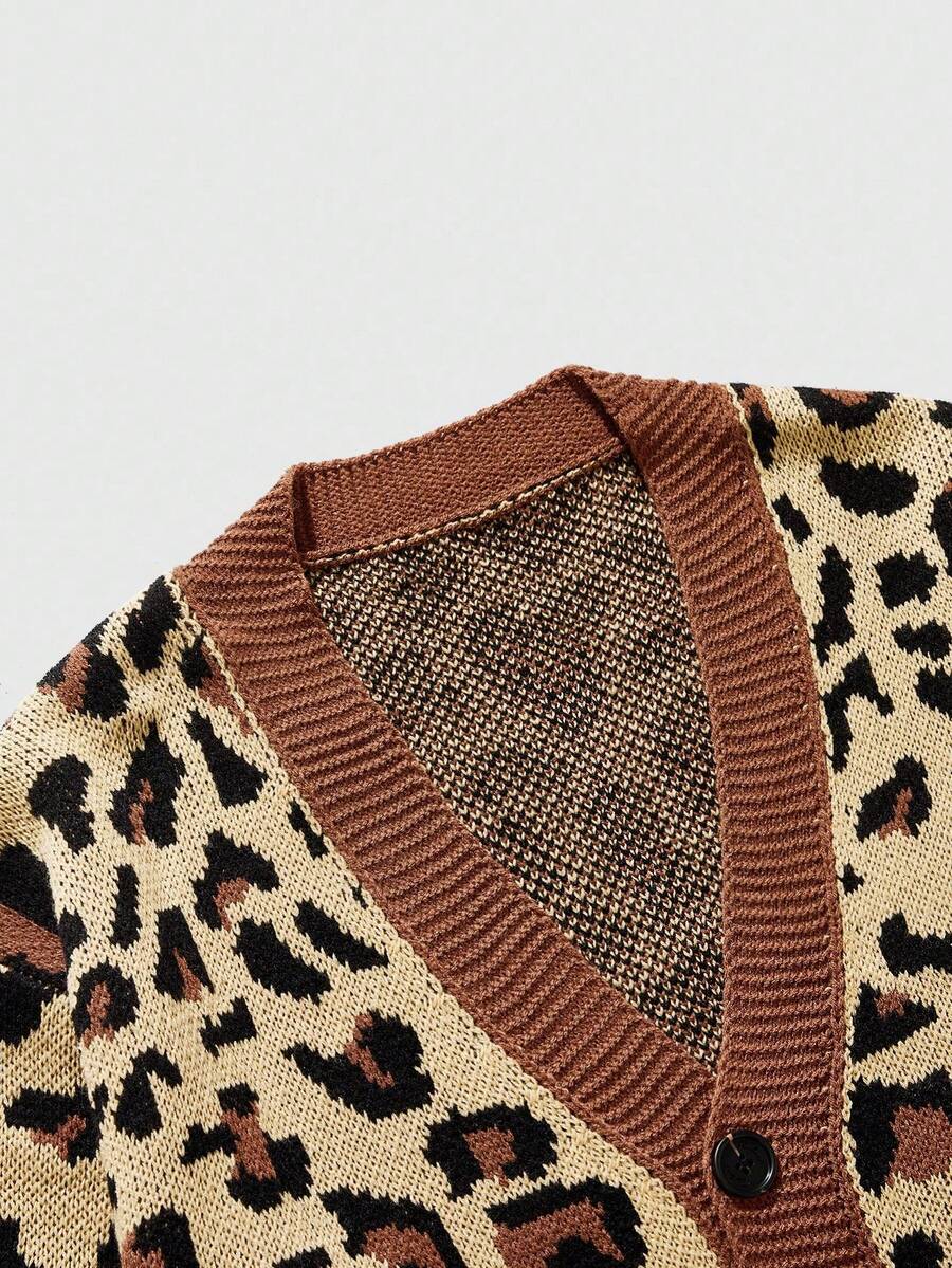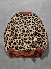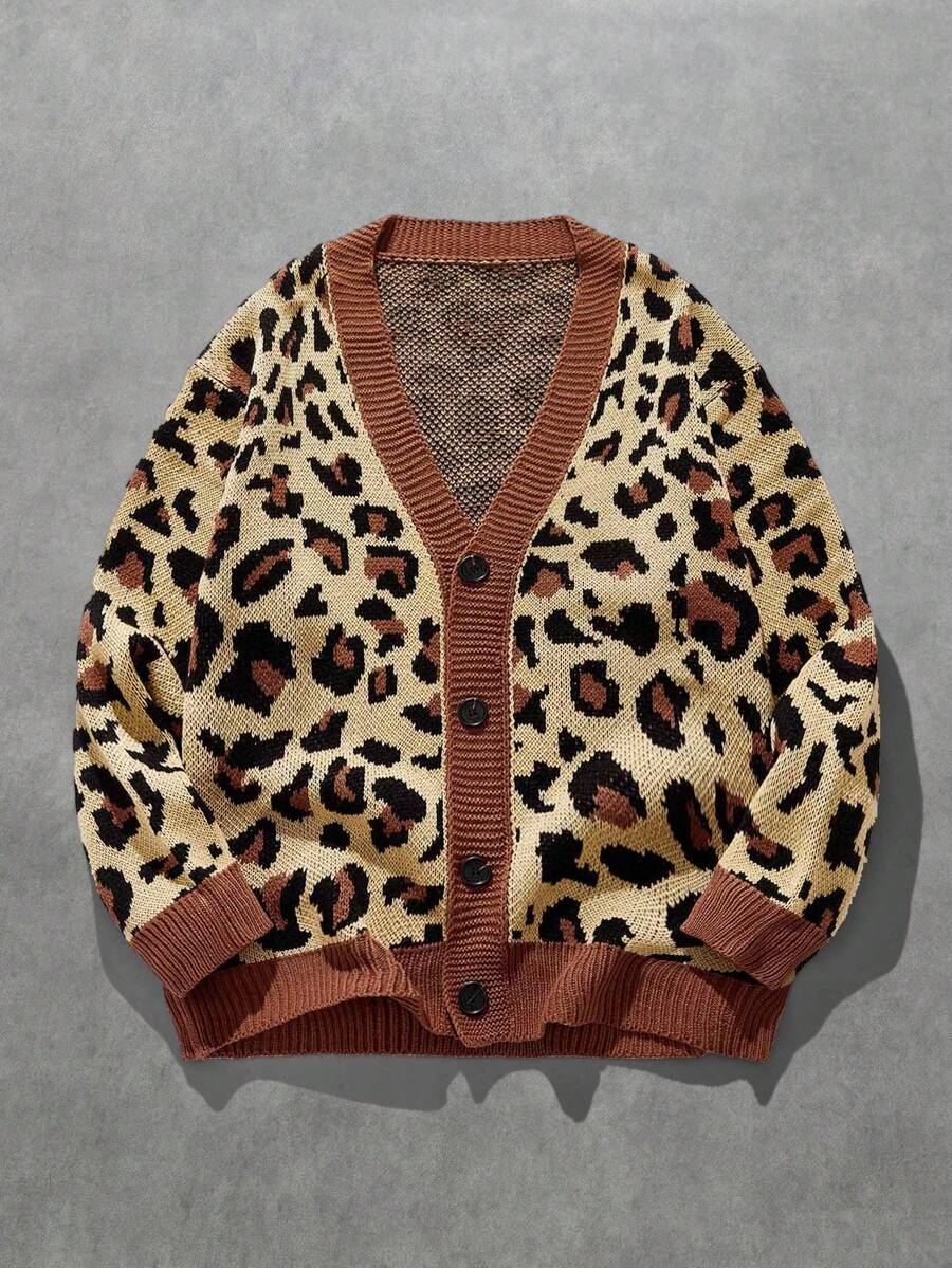 Street Life Cárdigan suelto de punto con cuello en V y estampado de leopardo de hombros caídos y abotonadura sencilla para hombre, otoño e invierno