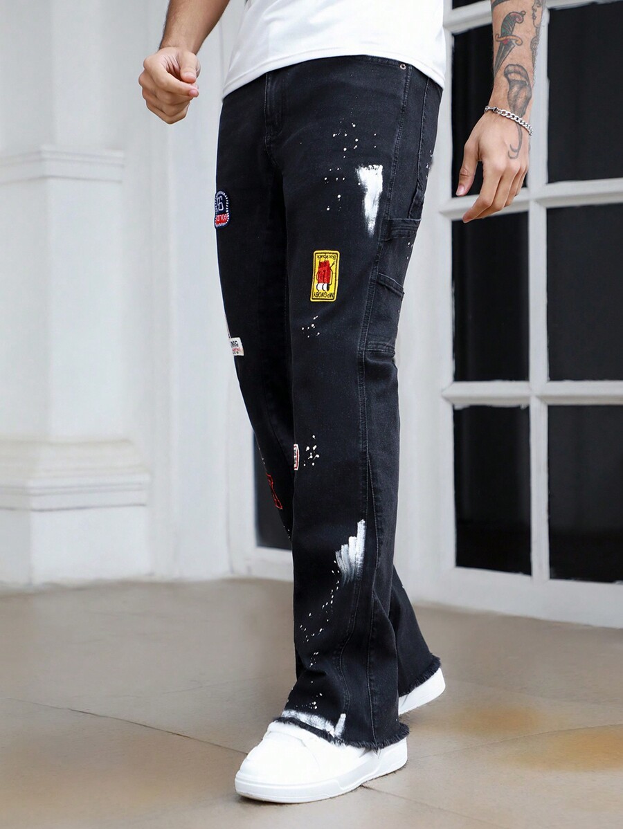 Street Life Pantalones vaqueros negros de mezclilla con bordado y desgaste para hombres