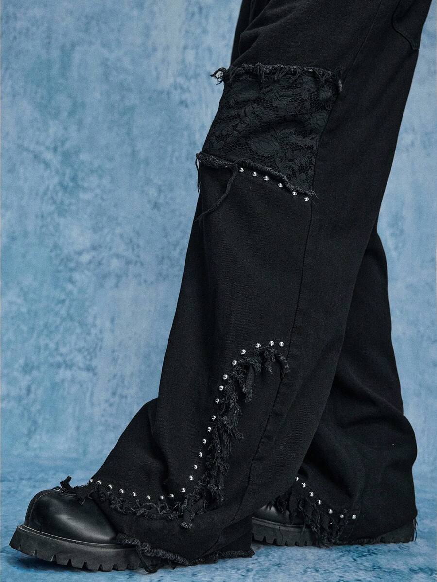 Street Life Jeans de pierna ancha con detalles de remaches, parches y flecos en el bajo, moda callejera para hombres