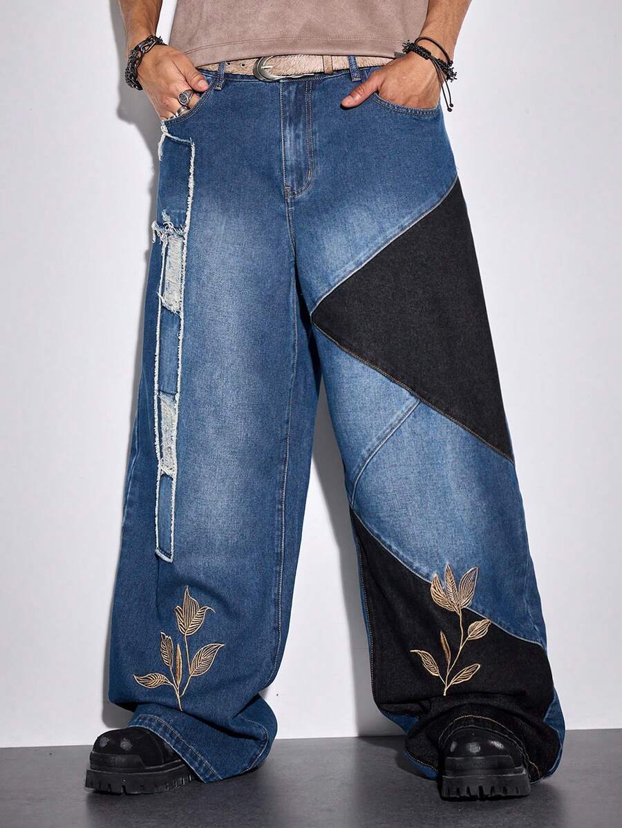Street Life Jeans casuales holgados con pierna ancha, bolsillo bordado con flores y desgastados para hombres