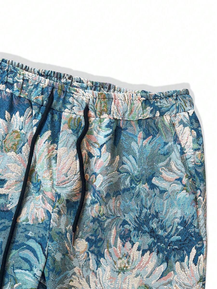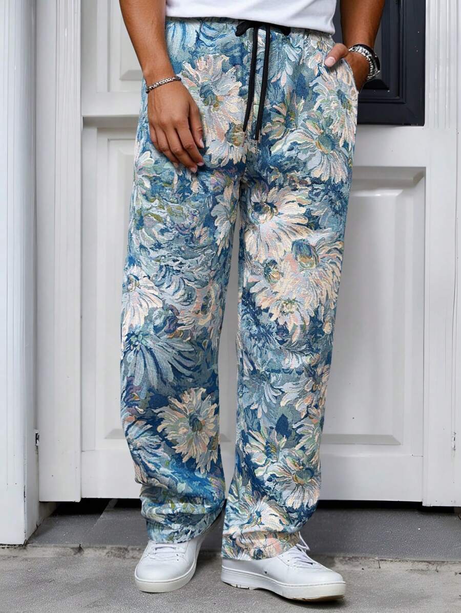 Street Life Pantalones sueltos casuales con estampado floral completo y cordón en la cintura para hombres