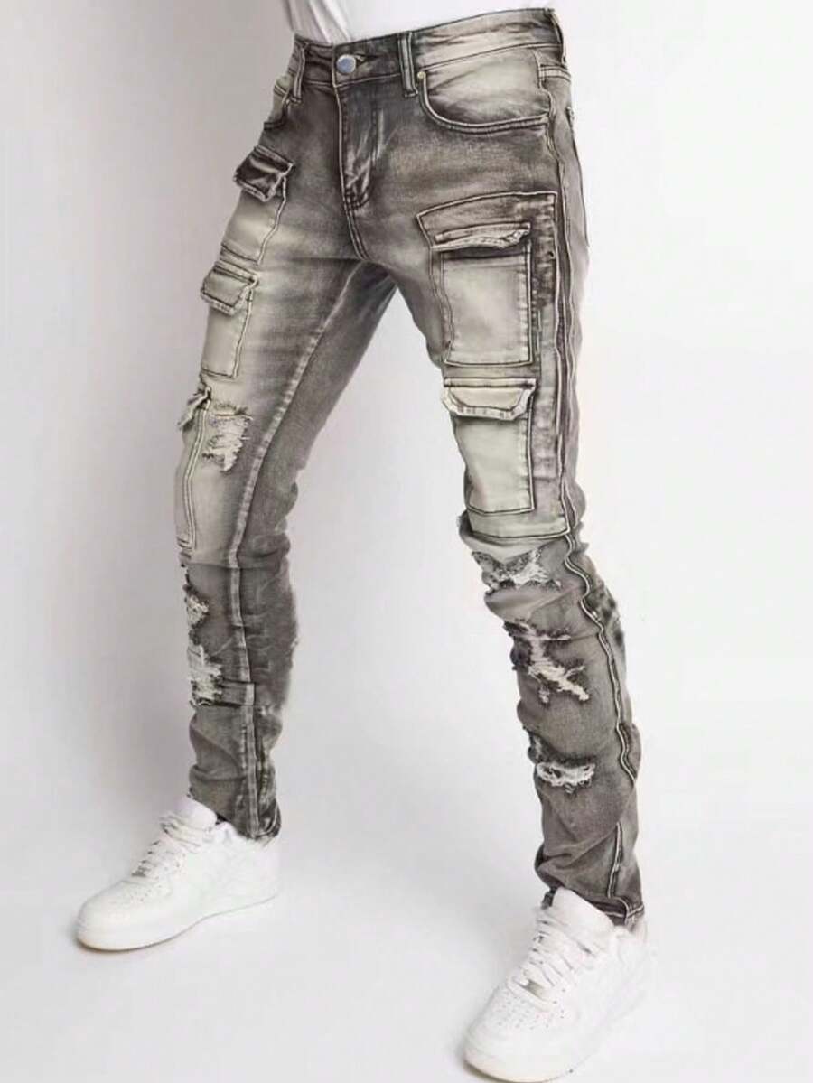 Street Life Pantalones vaqueros de mezclilla con múltiples bolsillos y cierre con botones delanteros desgastados, casuales para uso diario para hombres