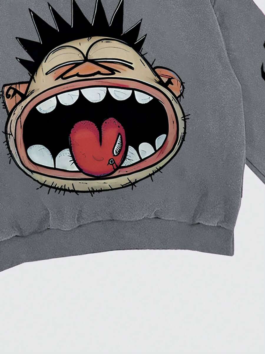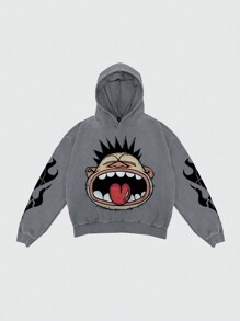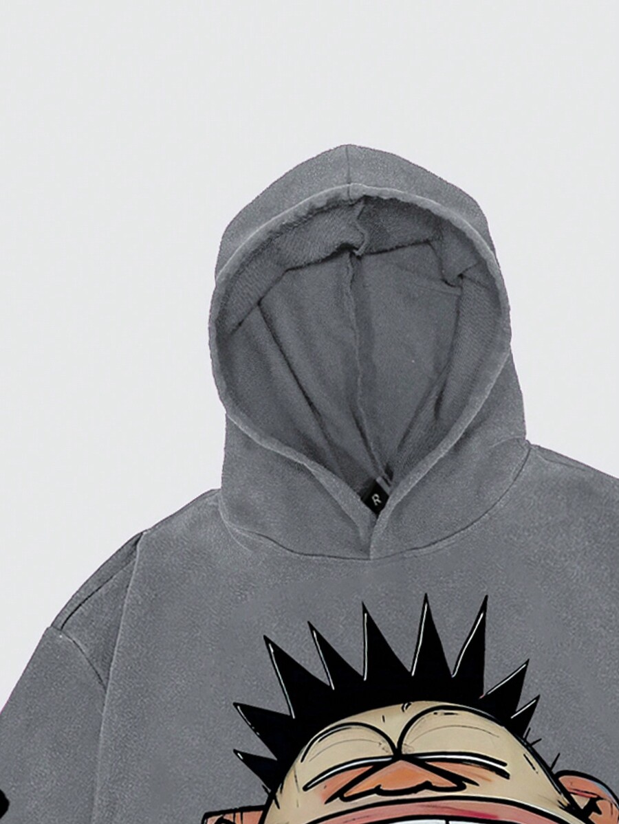Street Life Sudadera con capucha suelta y desgastada con estampado de personajes de dibujos animados divertidos para hombres