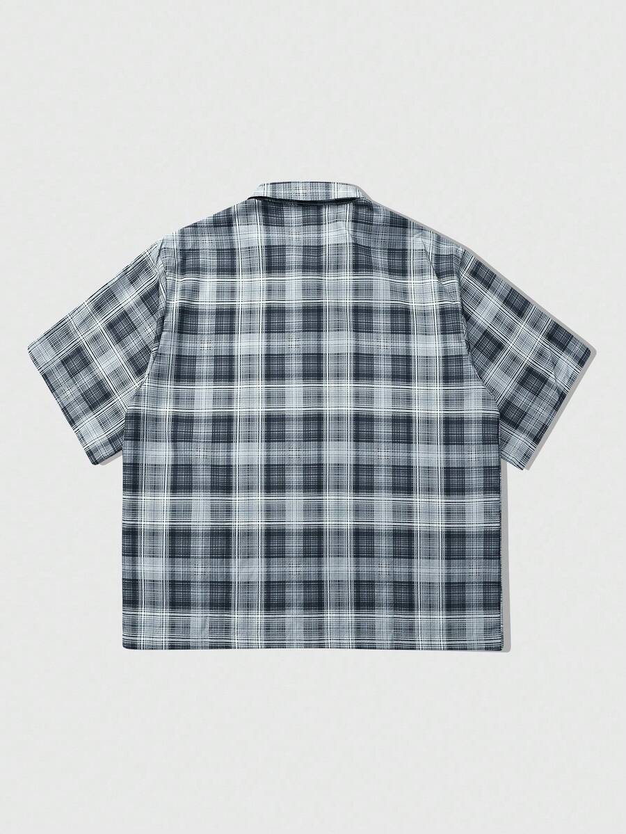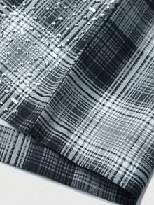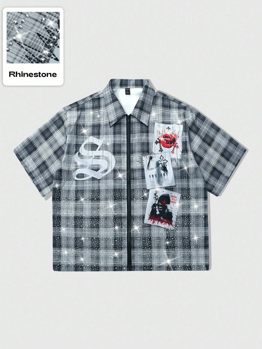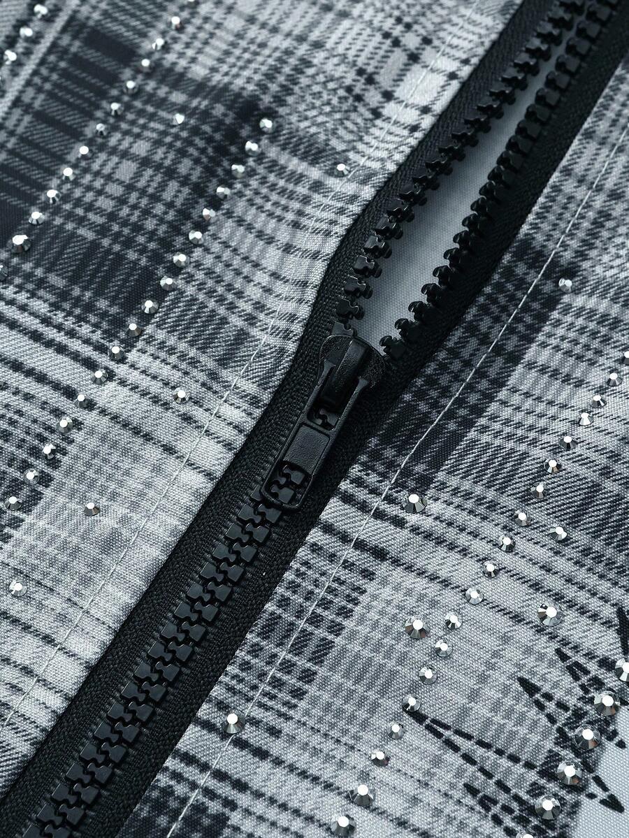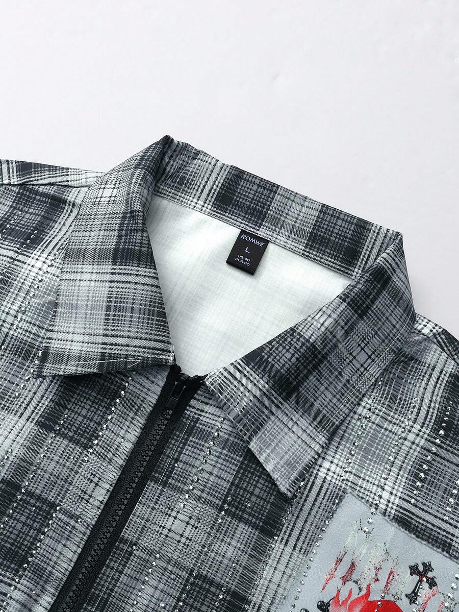Street Life Camisa casual con cremallera, estampado de rostro gótico, decoración de rhinestones, patrón de cuadros, para Halloween
