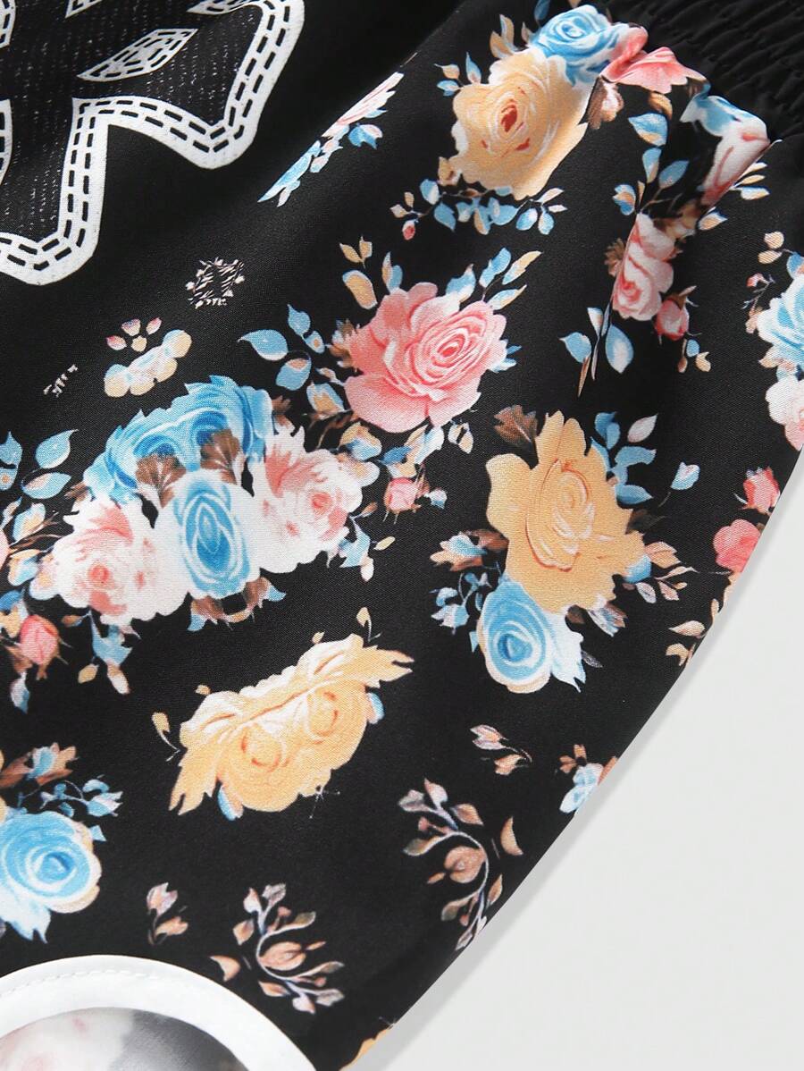 Prep Pantalones cortos casuales con cintura elástica con estampado de letras y flores para hombres