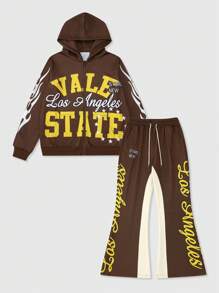 Street Life Conjunto informal de 2 piezas con sudadera con capucha con cremallera y estampado de letras, y pantalón de chándal para hombre, apto para otoño/invierno