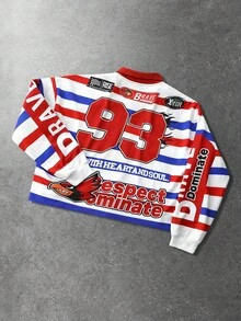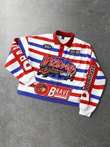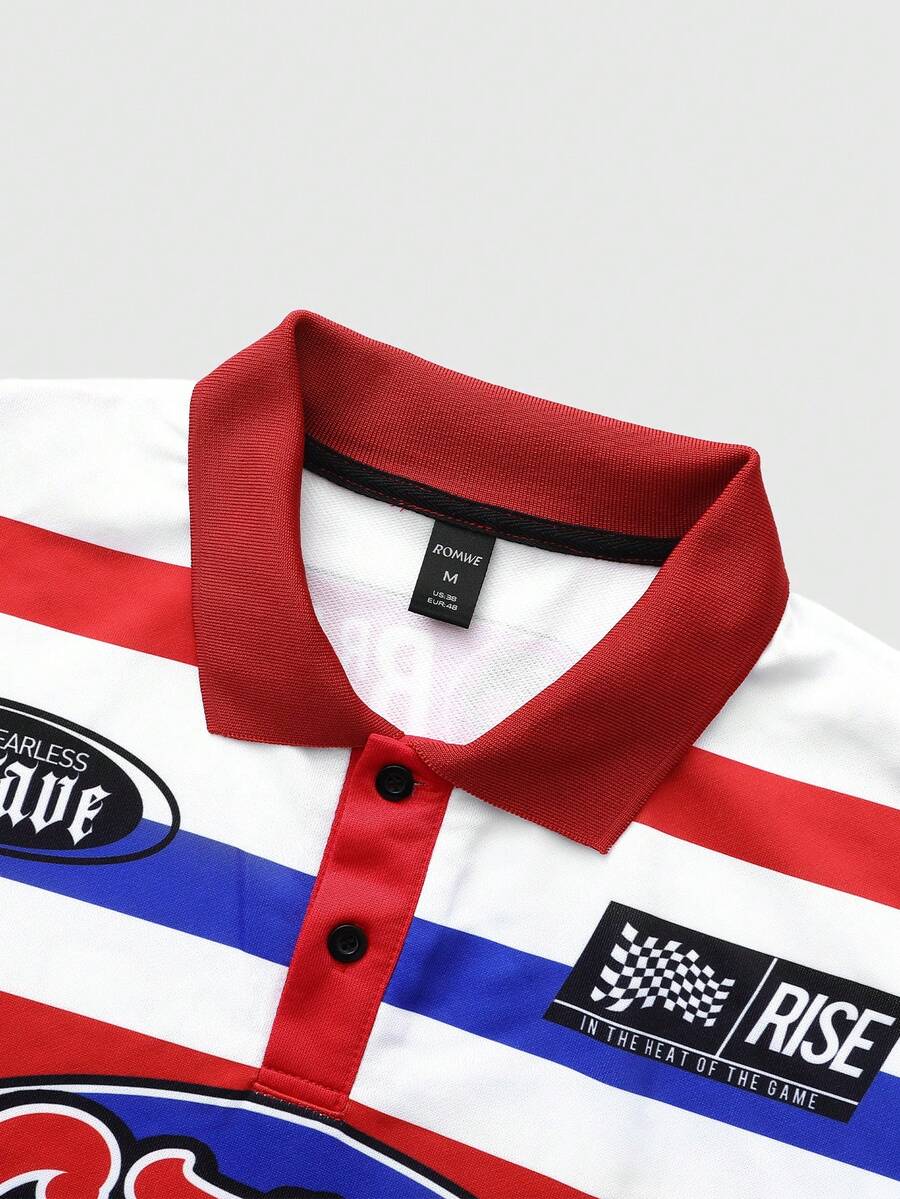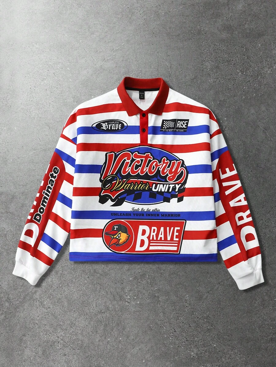 Street Life Camisa polo de manga larga casual y deportiva con estampado de letras y rayas para hombre