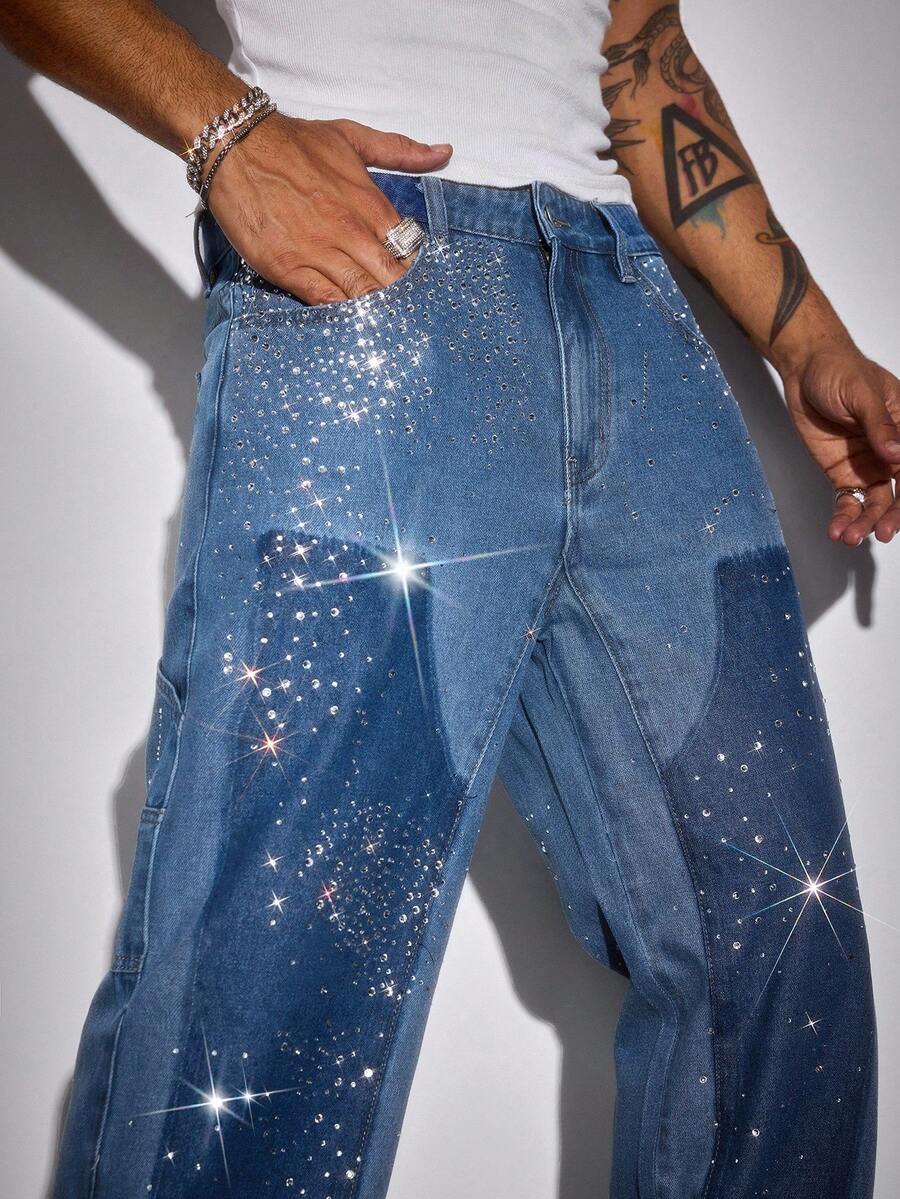 Street Life Jeans holgados con bolsillos y pierna acampanada con adornos de rhinestones para hombres