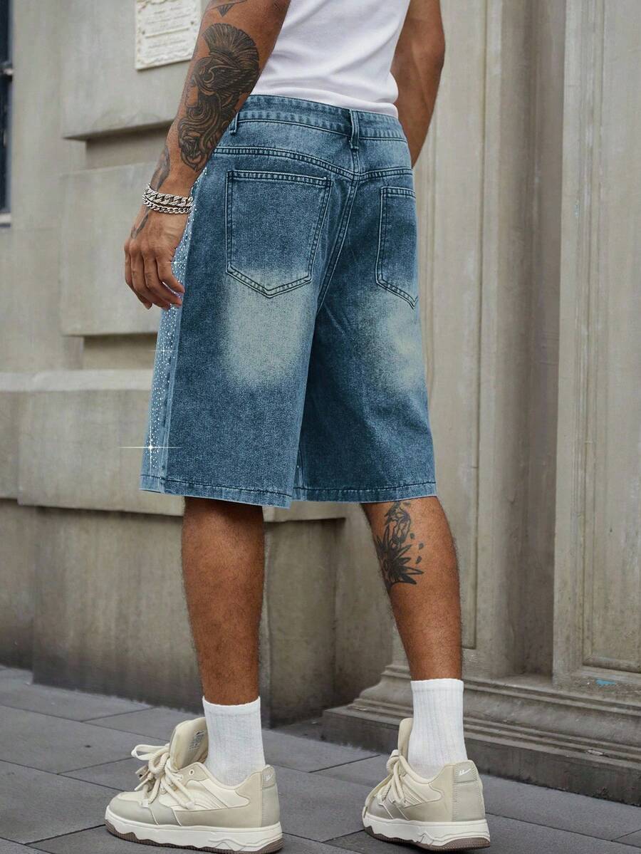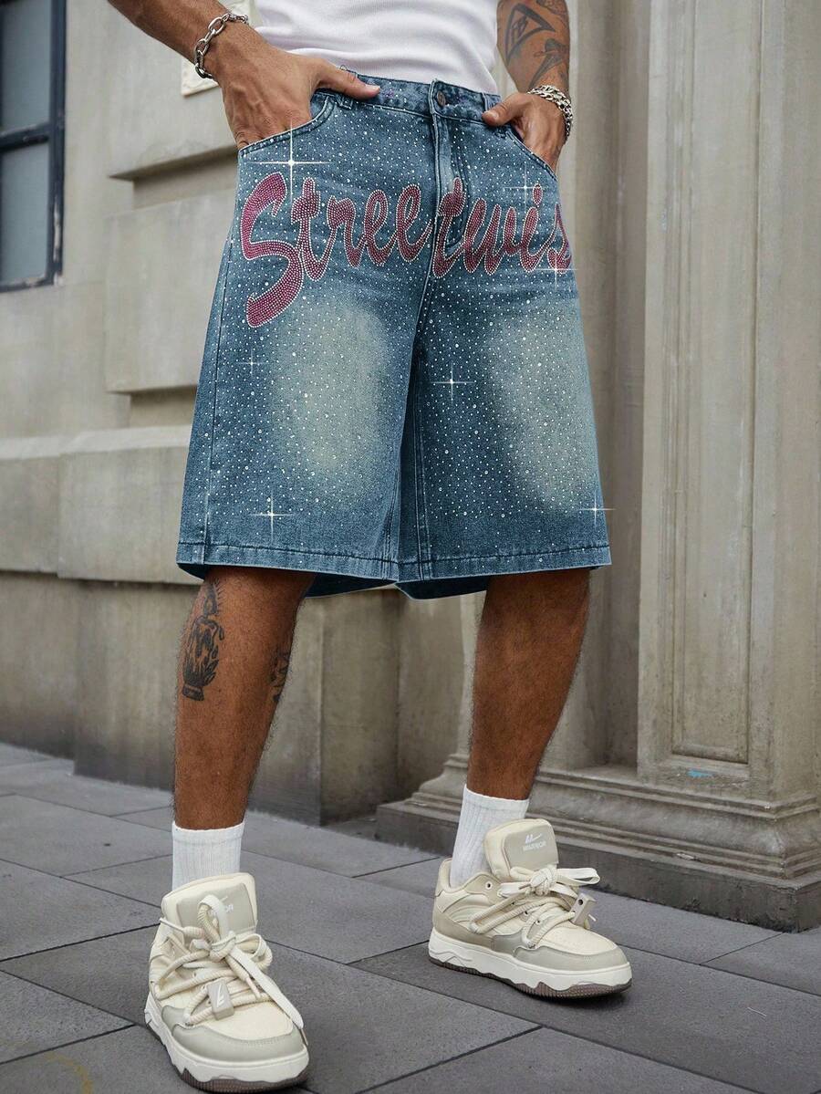 Street Life Pantalones cortos de mezclilla con aplicaciones de rhinestones para hombre, corte holgado