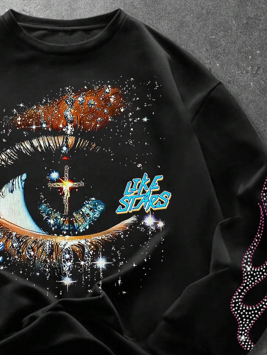 Street Life Sudadera holgada para hombre con estampado de llamas y diamantes brillantes