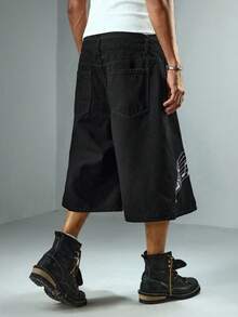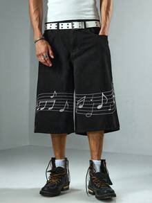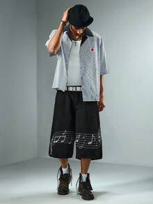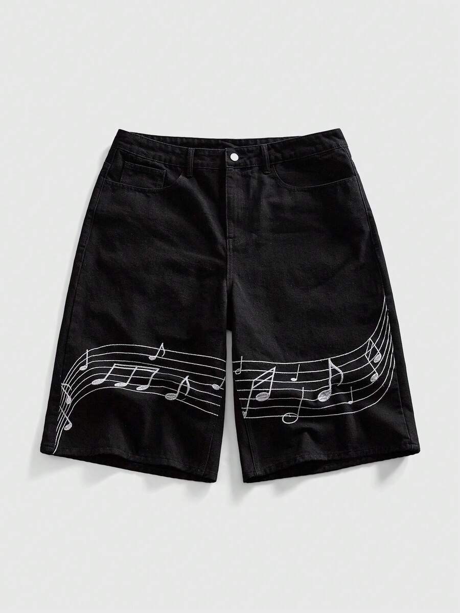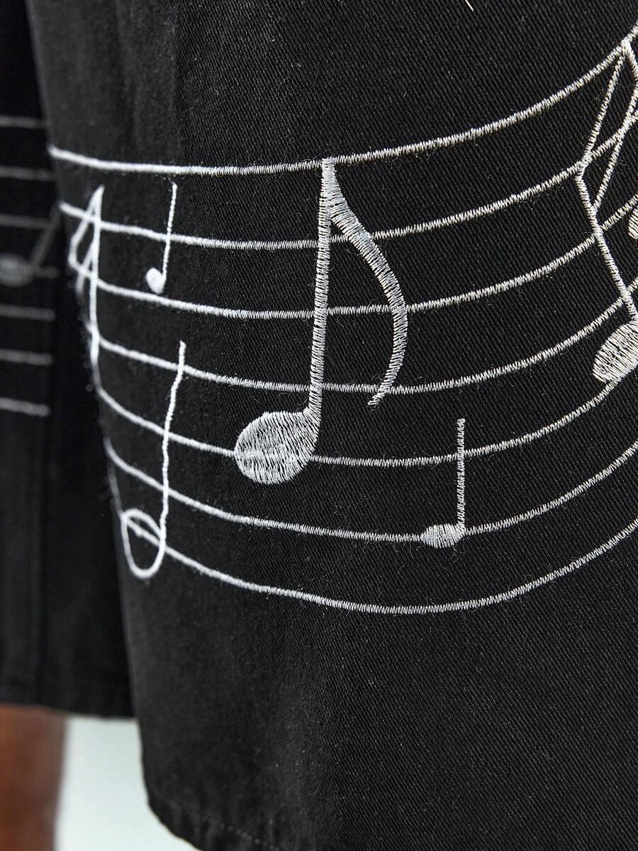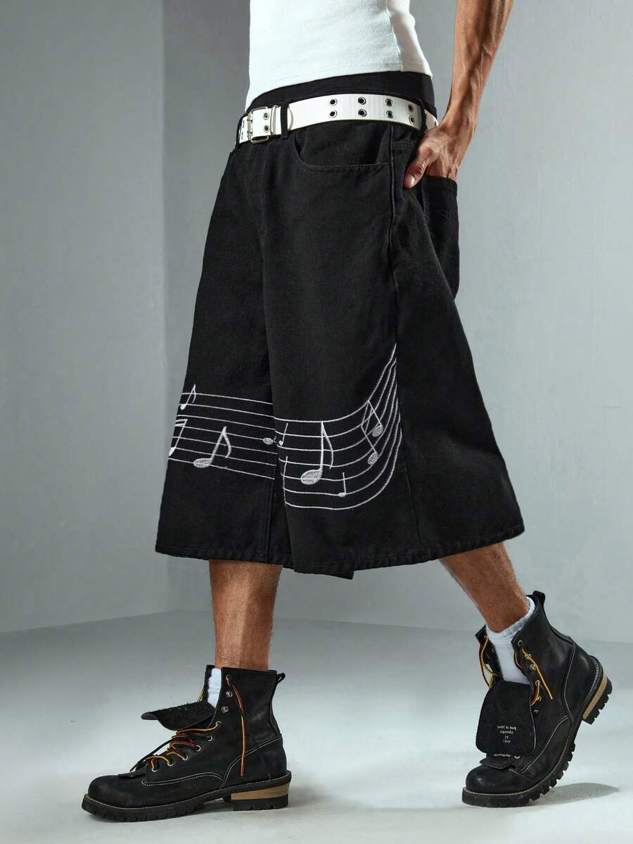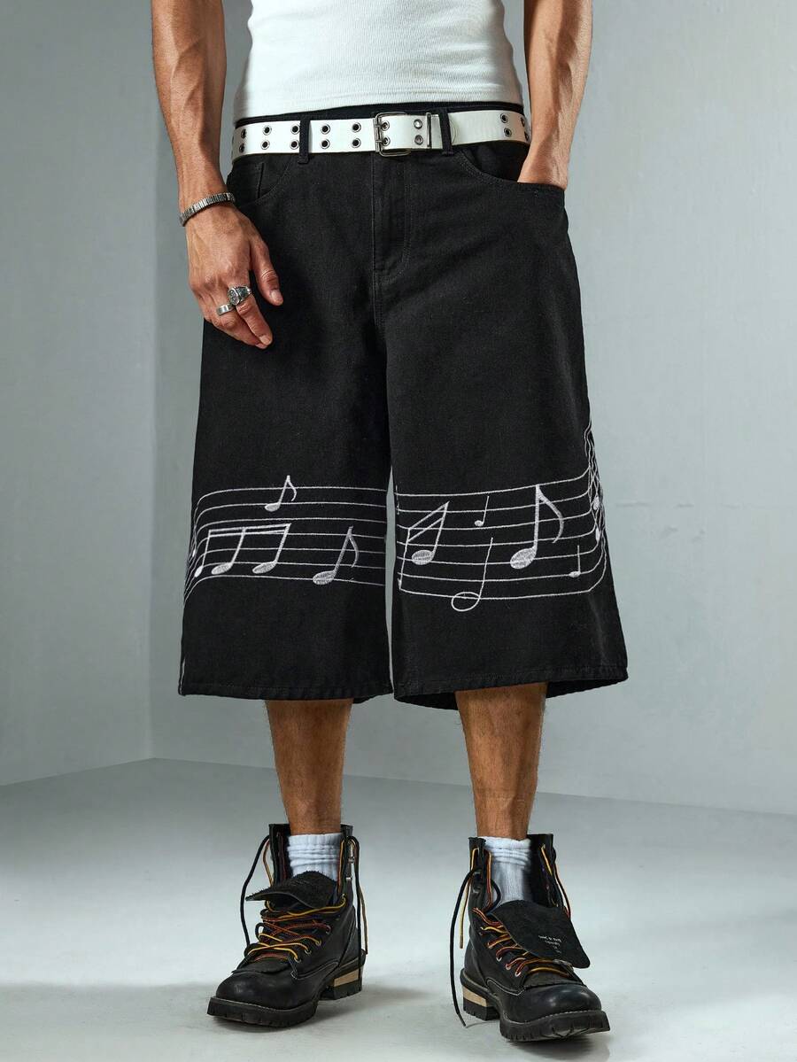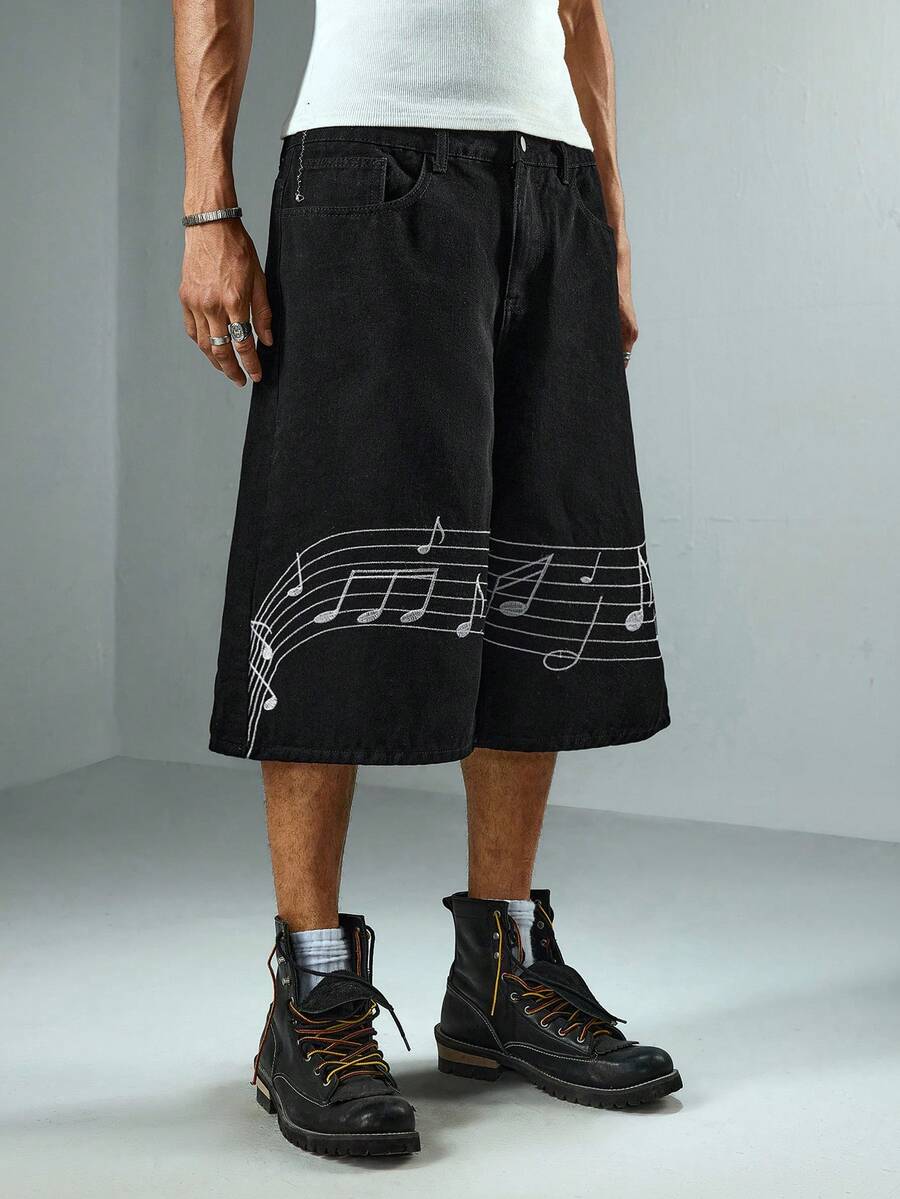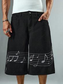 Street Life Pantalones cortos vaqueros de pierna ancha con bordado de nota musical para hombres