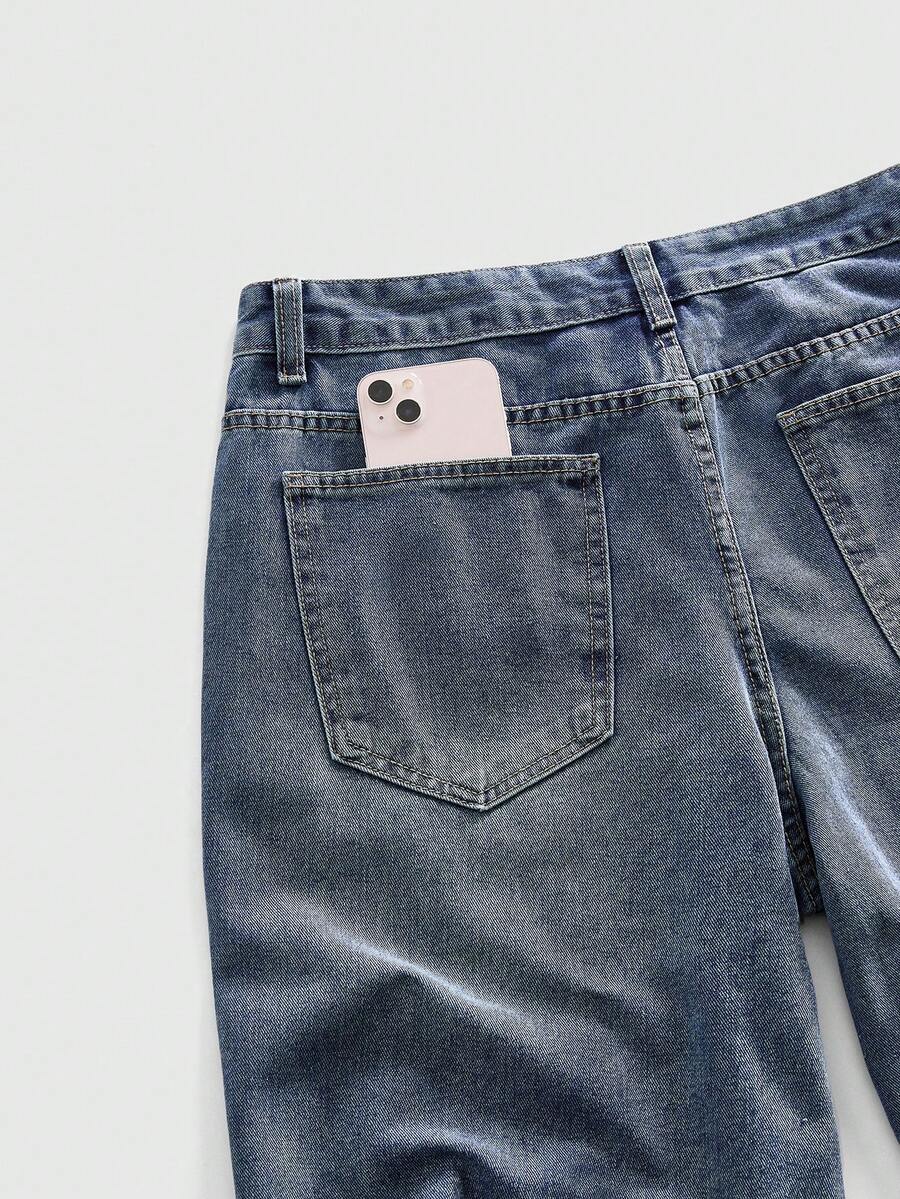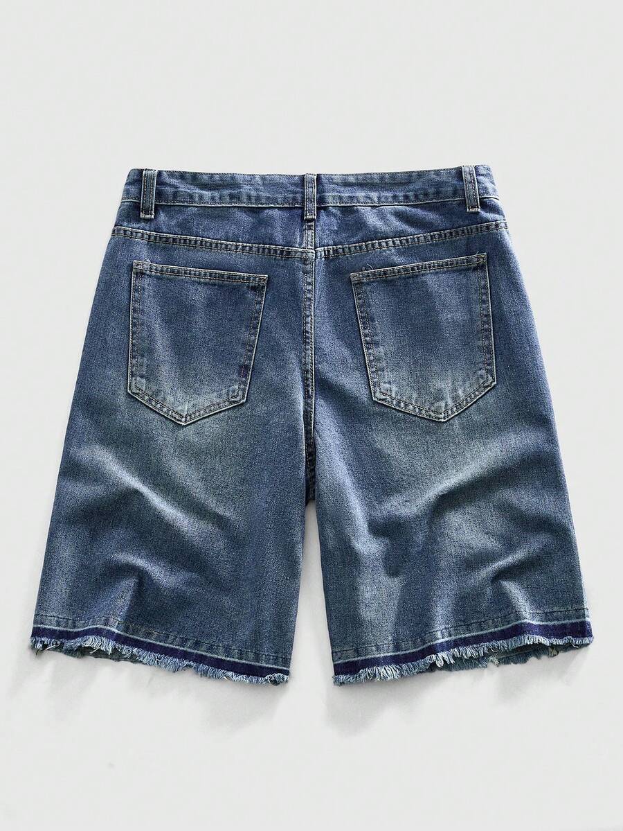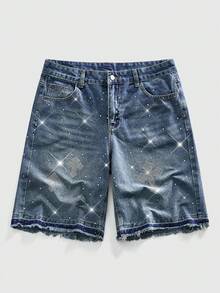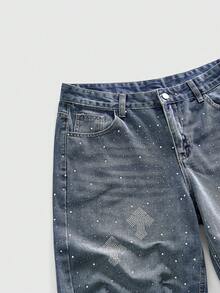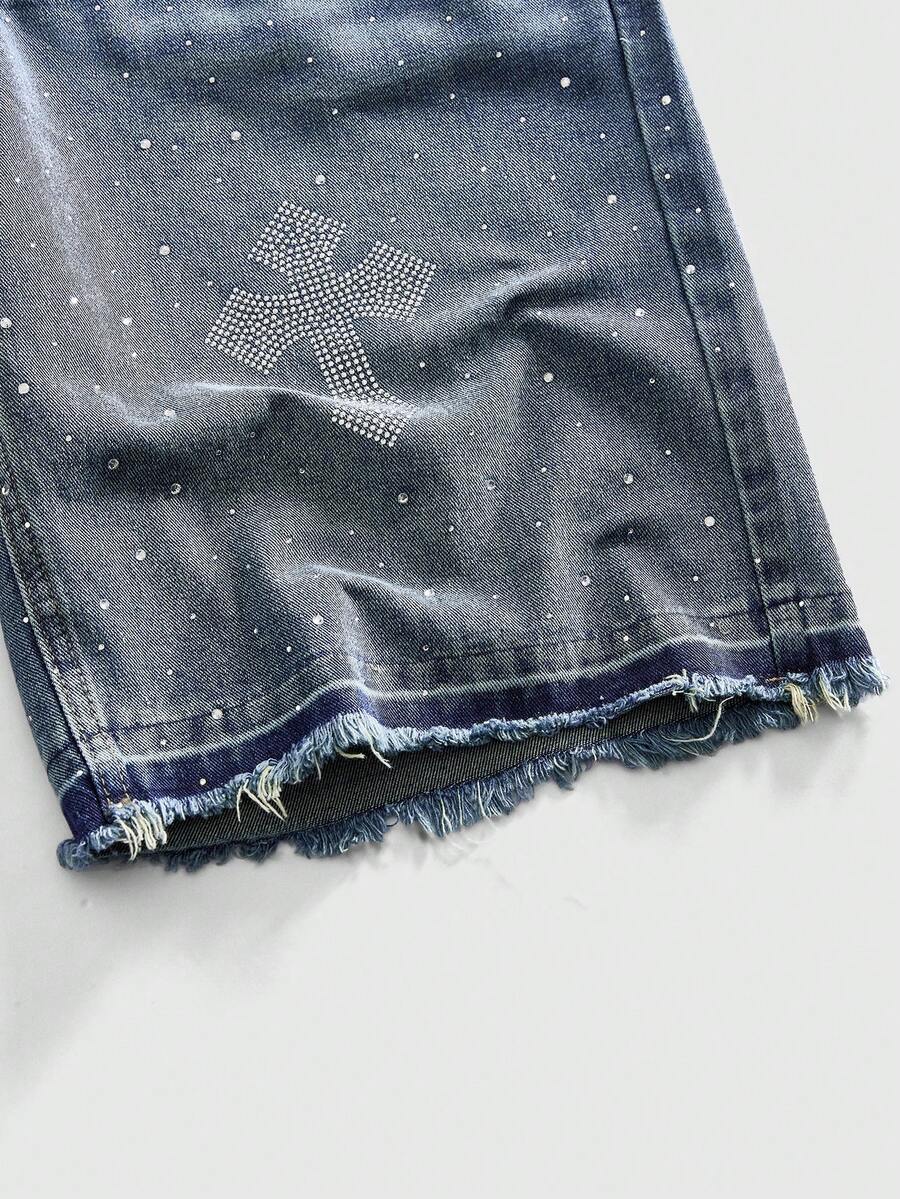 Street Life Pantalones cortos vaqueros casuales y versátiles para hombres con bolsillo, patrón de cruz de rhinestone y dobladillo deshilachado
