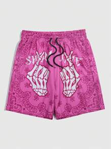 Street Life Pantalones Cortos De Cintura Con Cordón, Estampado De Mano De Calavera, Letra Y Cachemira Para Hombre En Verano