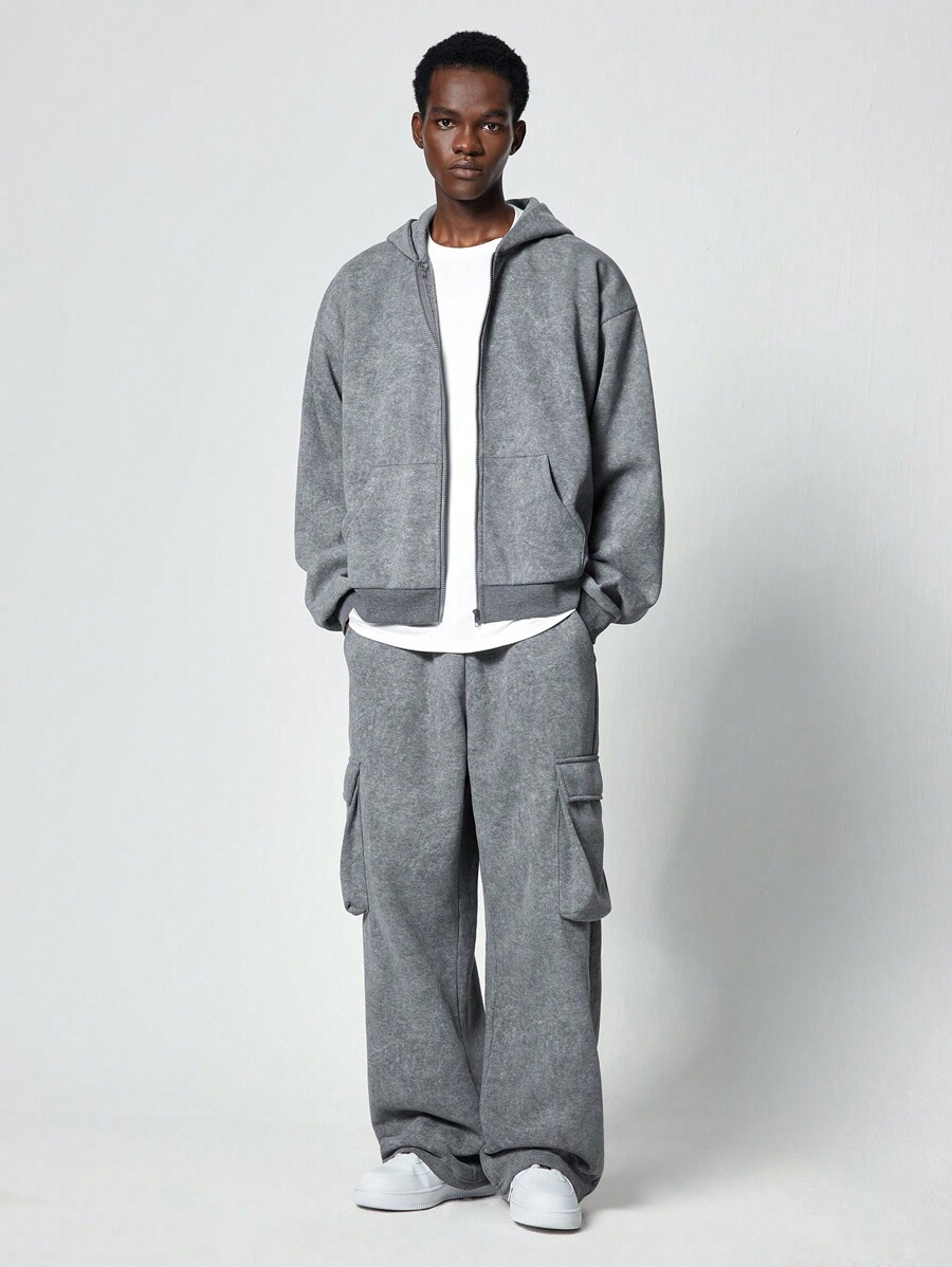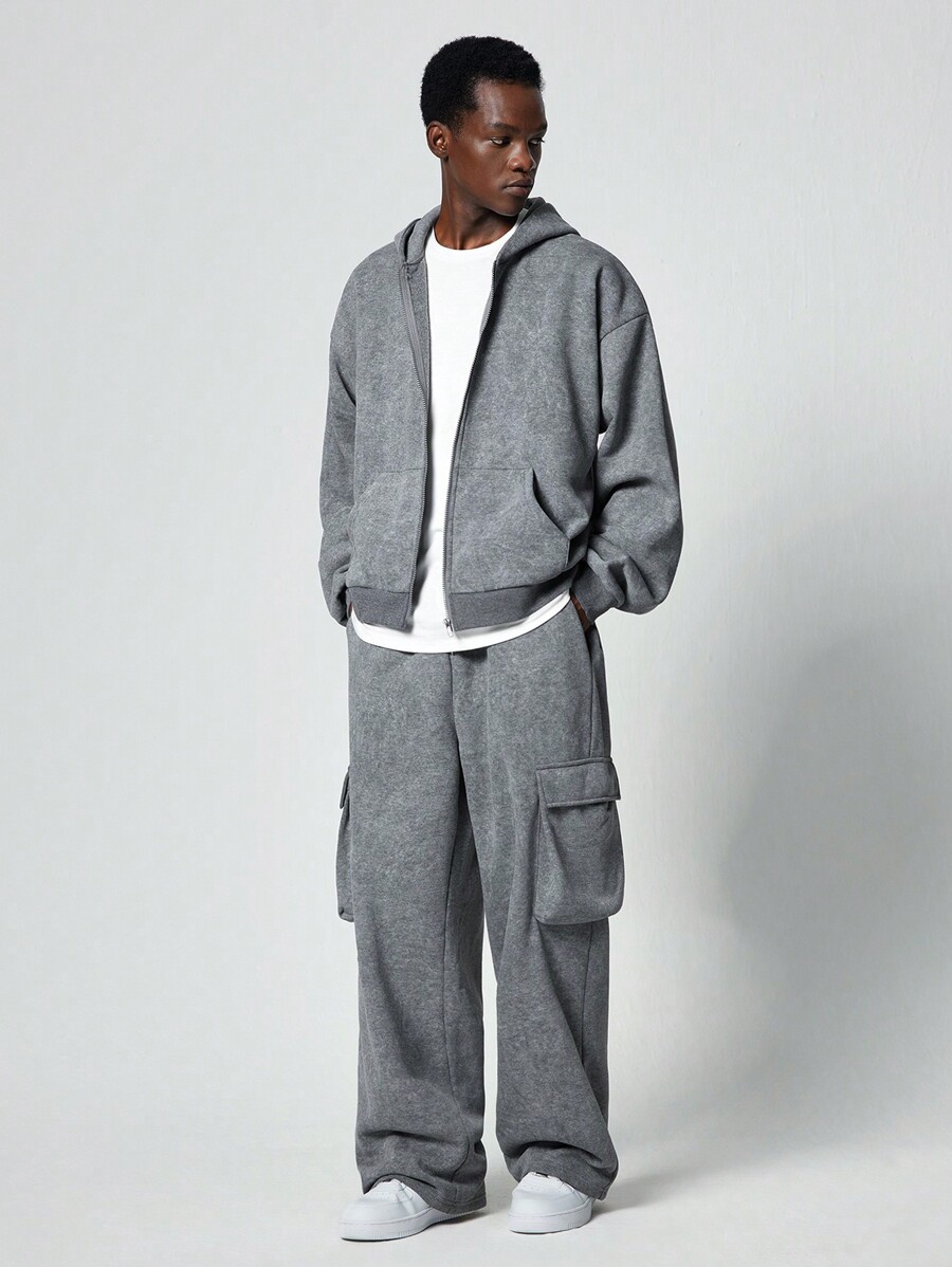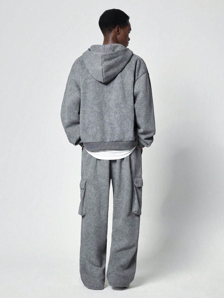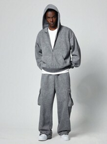 Street Life Conjunto de sudadera con capucha y pantalón de chándal de unicolor con cremallera delantera y hombros caídos para hombres, conjunto casual de otoño/invierno
