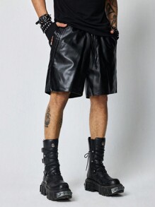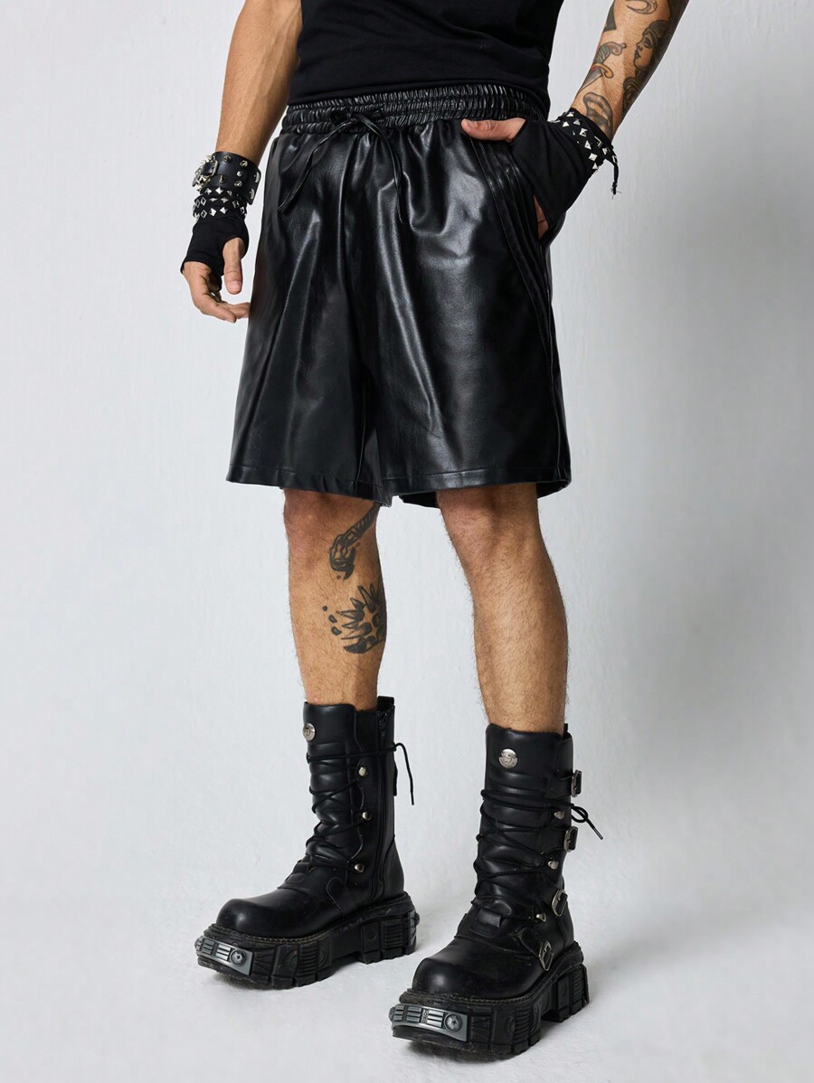 Grunge Punk Pantalones cortos de hombre de piel sintética sueltos con bolsillo parche de unicolor