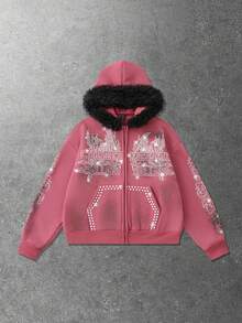 Street Life Sudadera con cuello de peluche con rhinestones brillantes para hombre, corte holgado