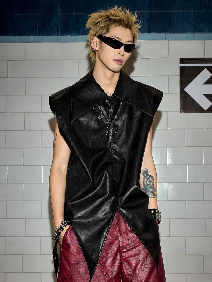Street Life Camiseta de tirantes de cuero PU asimétrica de moda urbana y hip hop para hombres