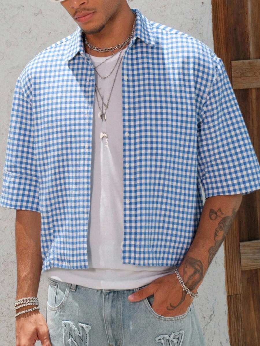 Prep Camisa casual de manga corta, de solapa única y a cuadros con eslogan de verano para hombre