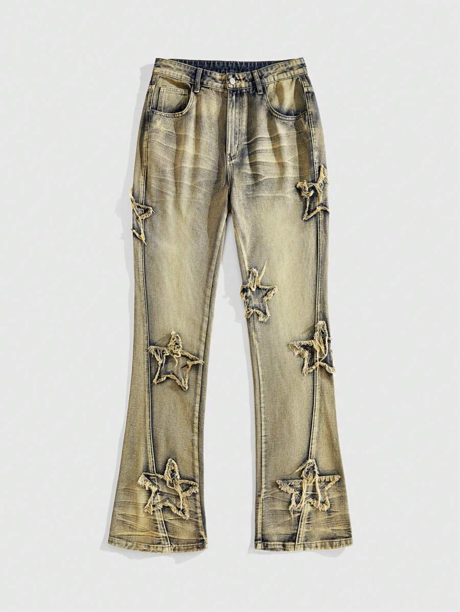 Street Life Jeans vaqueros ajustados con lavado vintage y parches bordados con estrellas para hombres