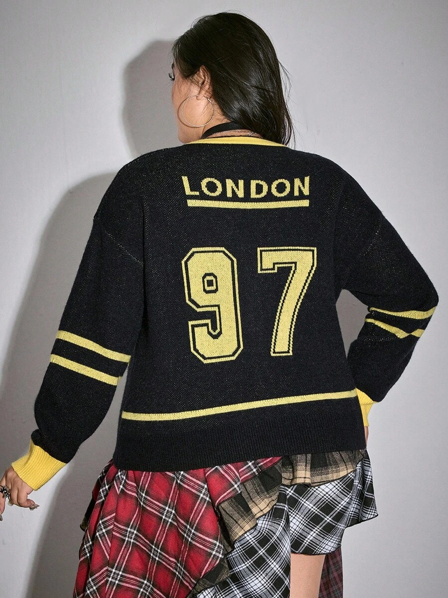 Street Life Cárdigan holgado de punto para mujer de talla grande con diseño de letras, números y bloques de color inspirados en la calle y la escuela, adecuado para deportes de otoño/invierno