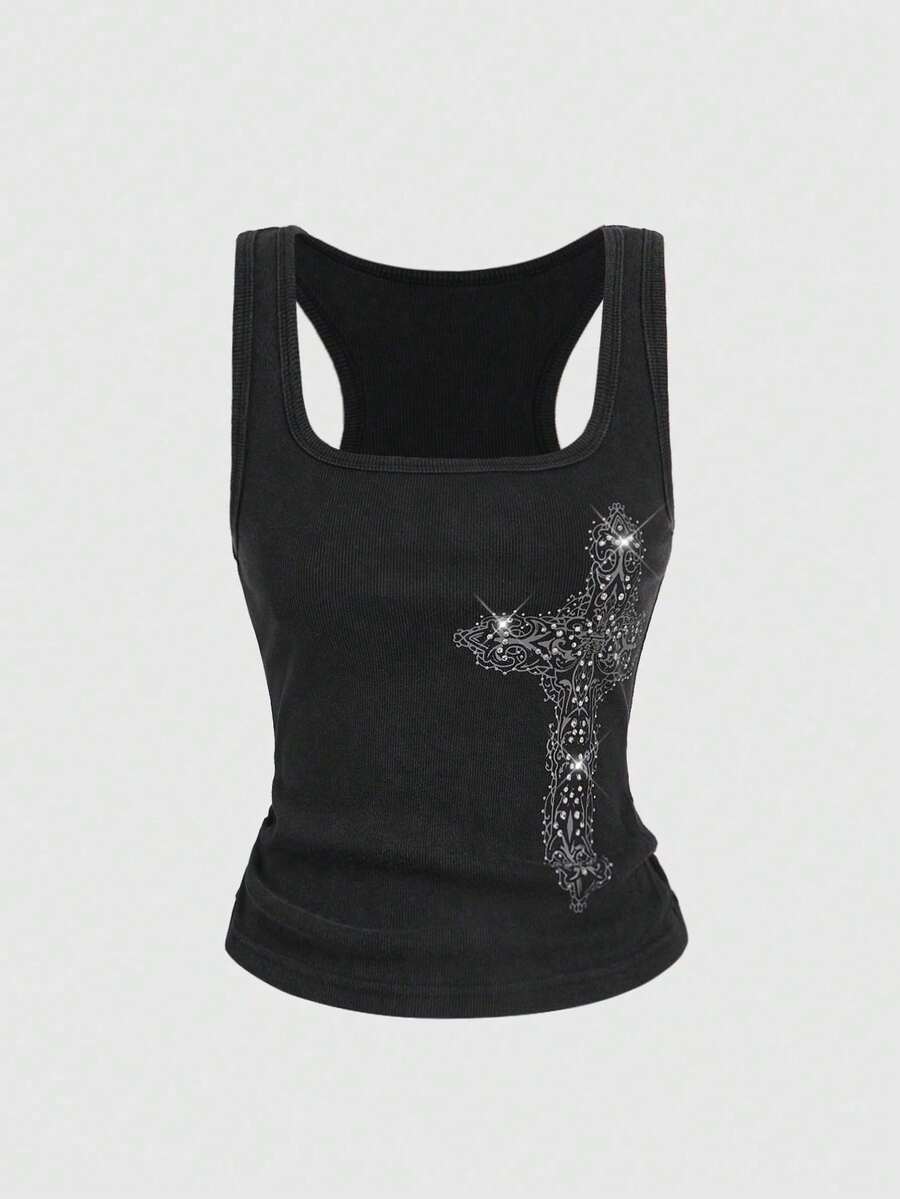 Street Life Camiseta ajustada con estampado de cruz de grunge y lavado con rhinestones